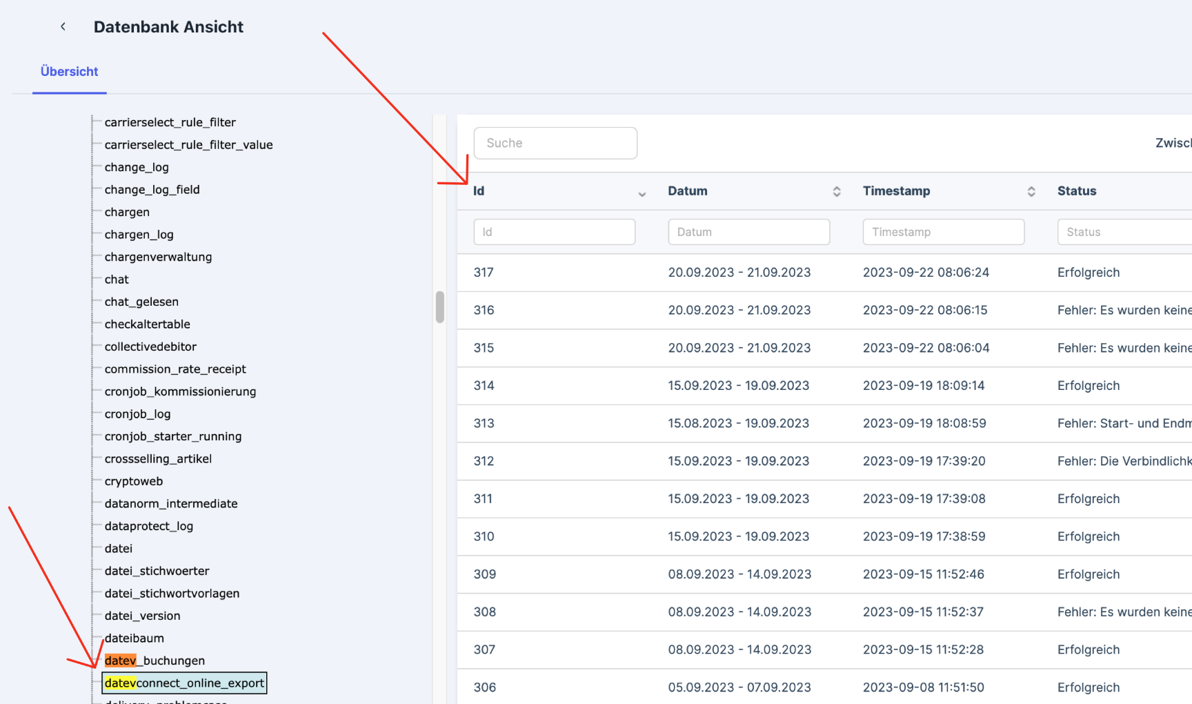 in der Tabelle datevconnect_online_export eingesehen werden. Hier bitte nach Id sortieren.