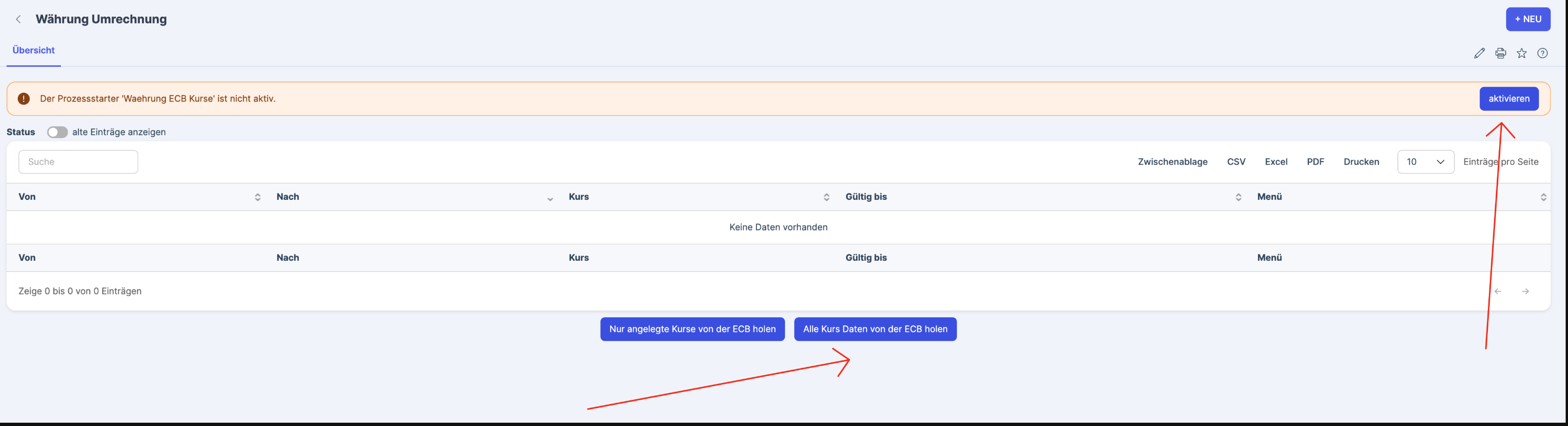 Am einfachsten ist es, die Kurse von der EZB zu laden und den Prozessstarter zu aktivieren, damit diese aktuell bleiben, wie im folgenden Screenshot zu sehen: