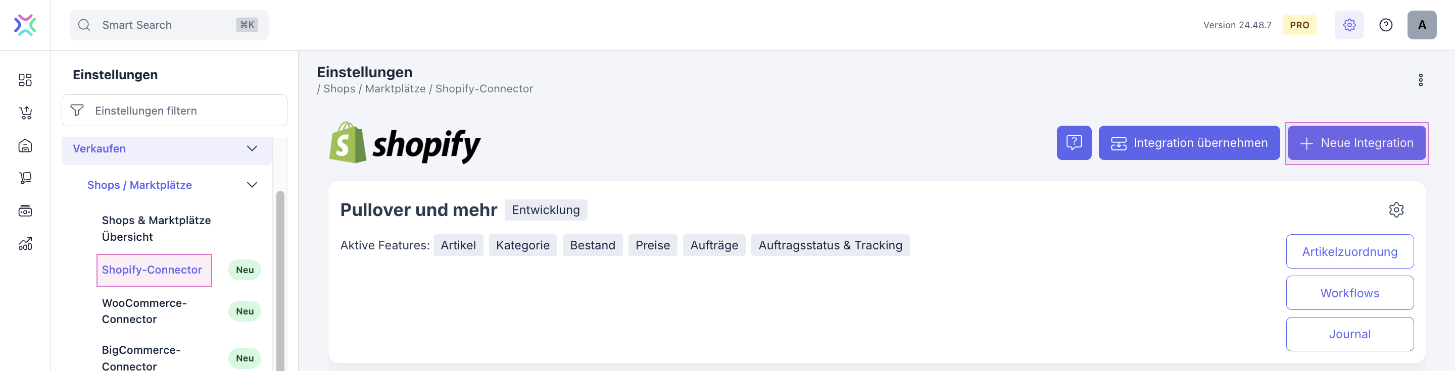 Folge dem Menüpfad Einstellungen > Verkaufen > Shops/Marktplätze > Shopify Connector.
