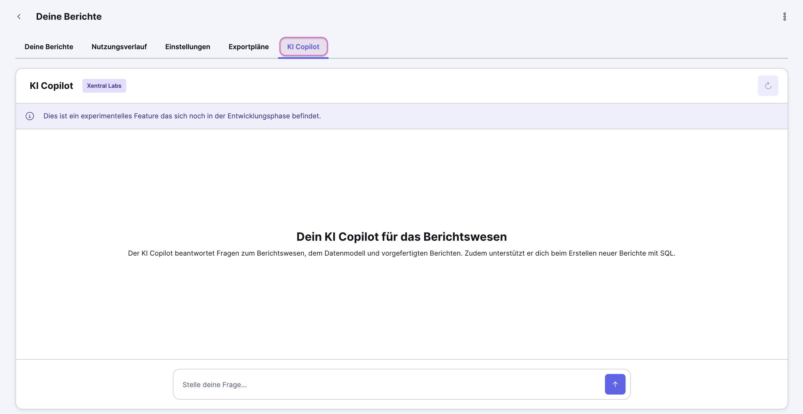 Der KI Copilot ist ein KI-basiertes Tool, das dir hilft, Berichte einfacher und schneller zu erstellen sowie Fragen rund um das Berichtswesen zu beantworten. Der KI Copilot steht dir in einem separaten Tab im Modul Berichtswesen > Berichte zur Verfügunb.