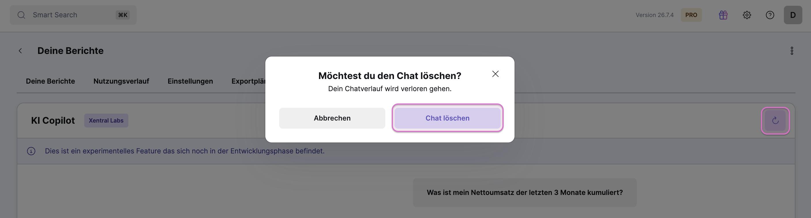 Der KI Copilot erkennt automatisch, wenn für deine Anfrage ein Bericht notwendig ist, und schaltet in den Erstellungsmodus für Berichte.