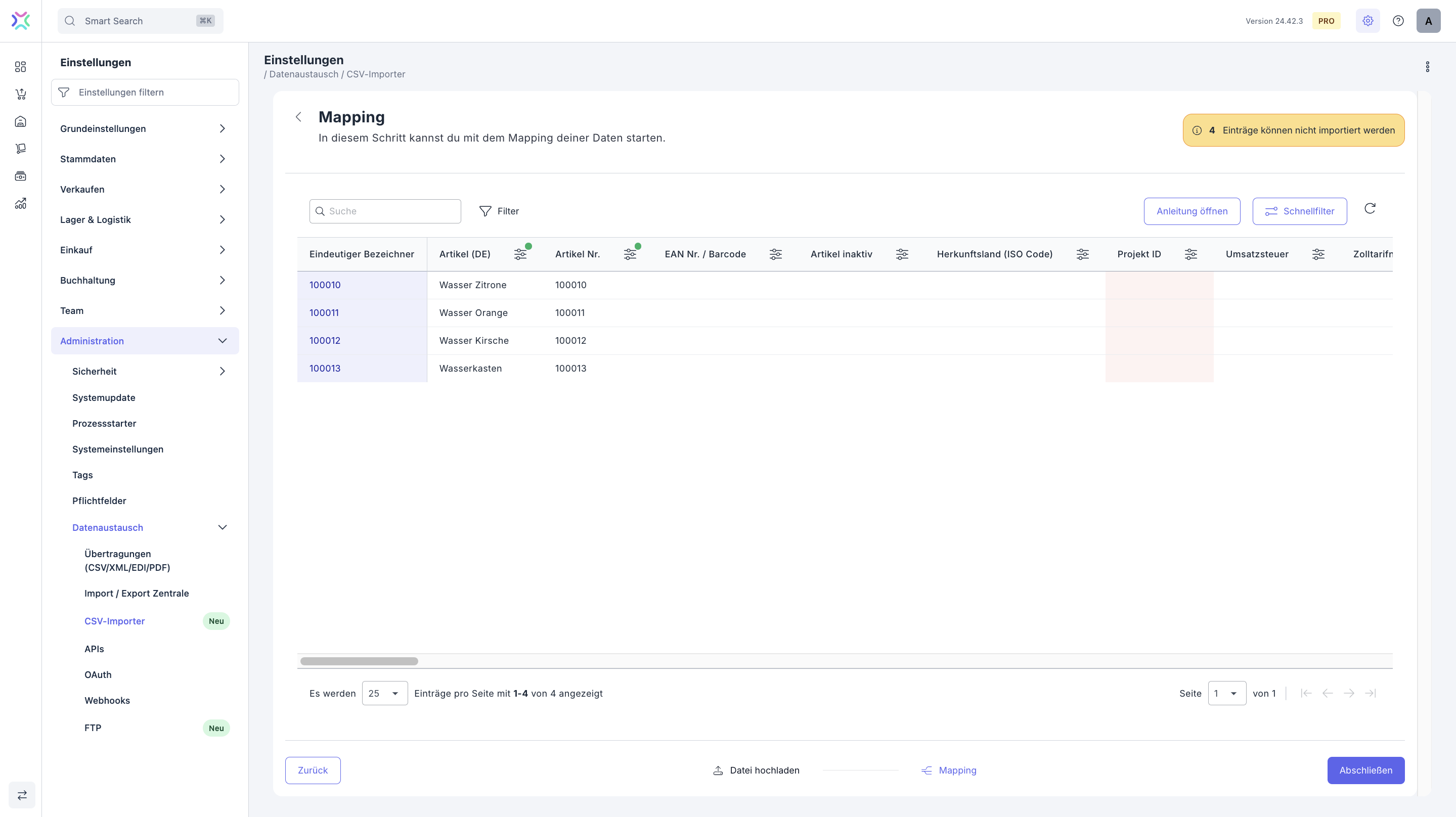 Beachte, dass ein in der CSV-Datei doppelt aufgeführter Datensatz (z. B. eine doppelt aufgeführte Artikelnummer) trotz eines unterschiedlichen Bezeichners nur einmal importiert wird. Stelle daher sicher, dass in der CSV-Datei jeder Datensatz nur einmal aufgeführt ist.