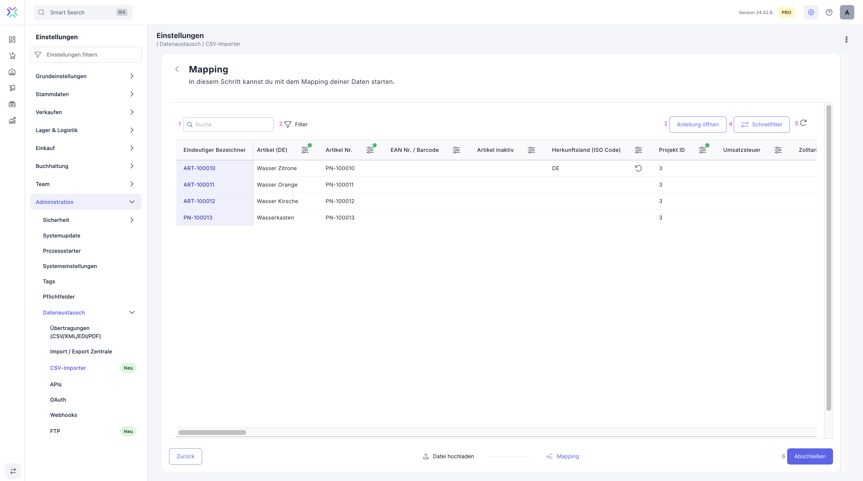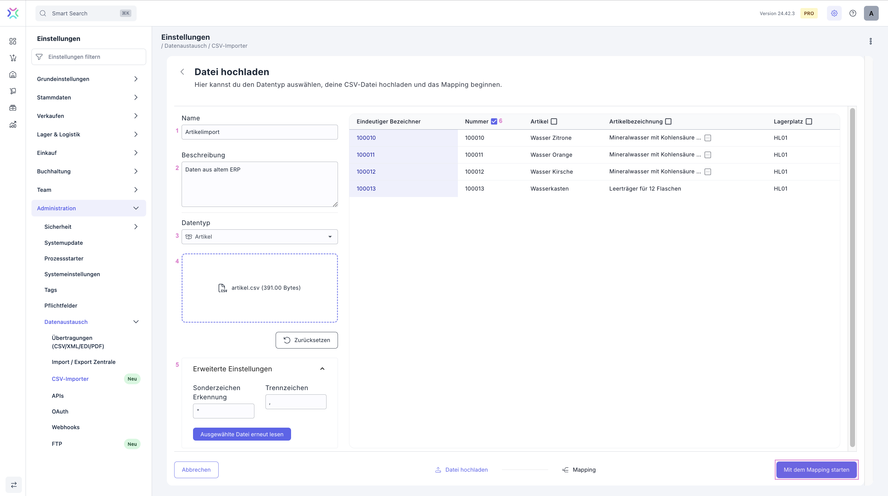 Du findest den CSV-Importer im Menü Einstellungen > Administration > Datenaustausch > CSV-Importer.