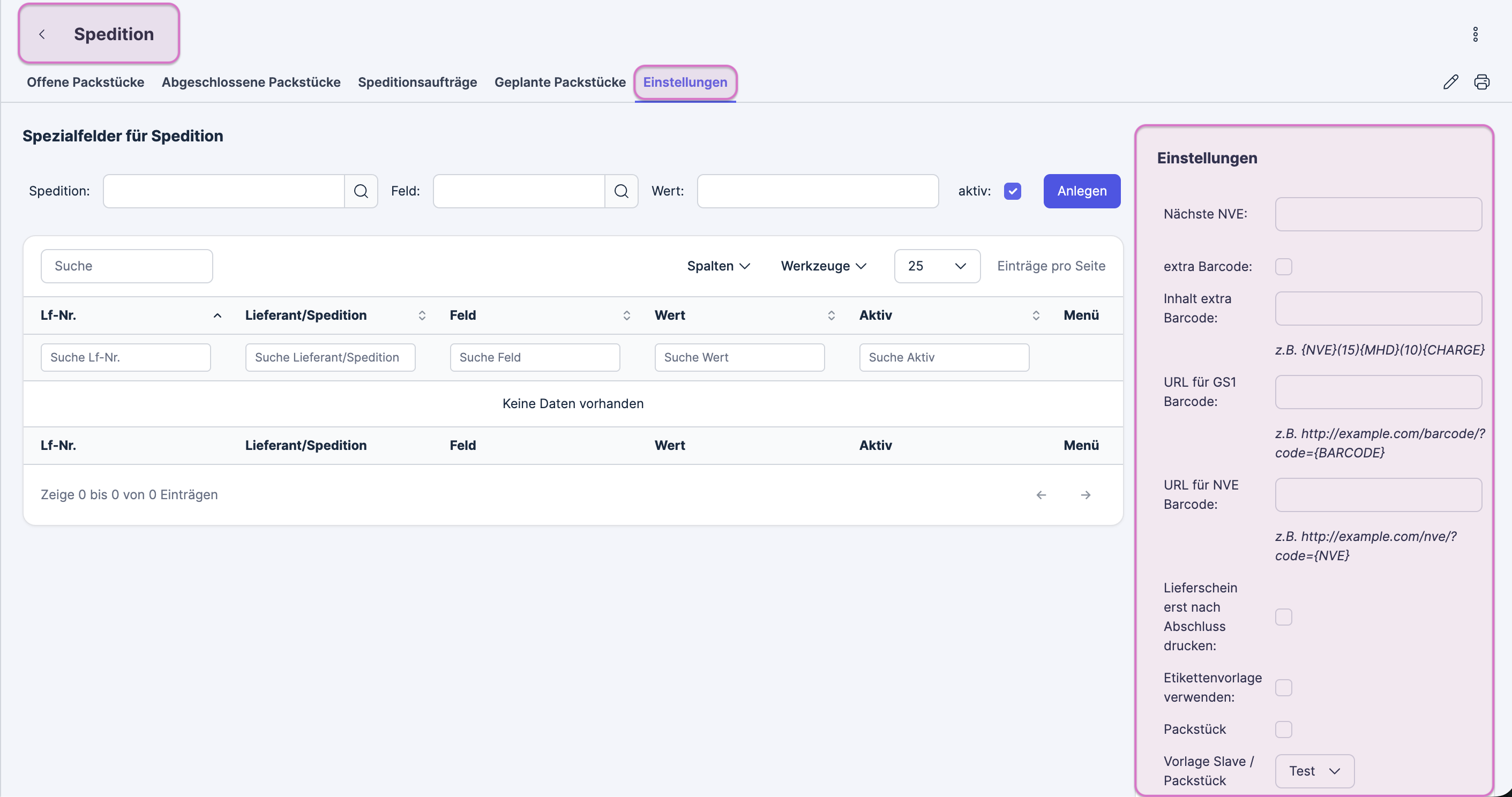 Im Tab Einstellungen des Moduls Spedition kannst du verschiedene Informationen pro Spedition definieren und eine Übersicht zu allen Speditionen sehen, zu denen du Spezialfelder angelegt hast.