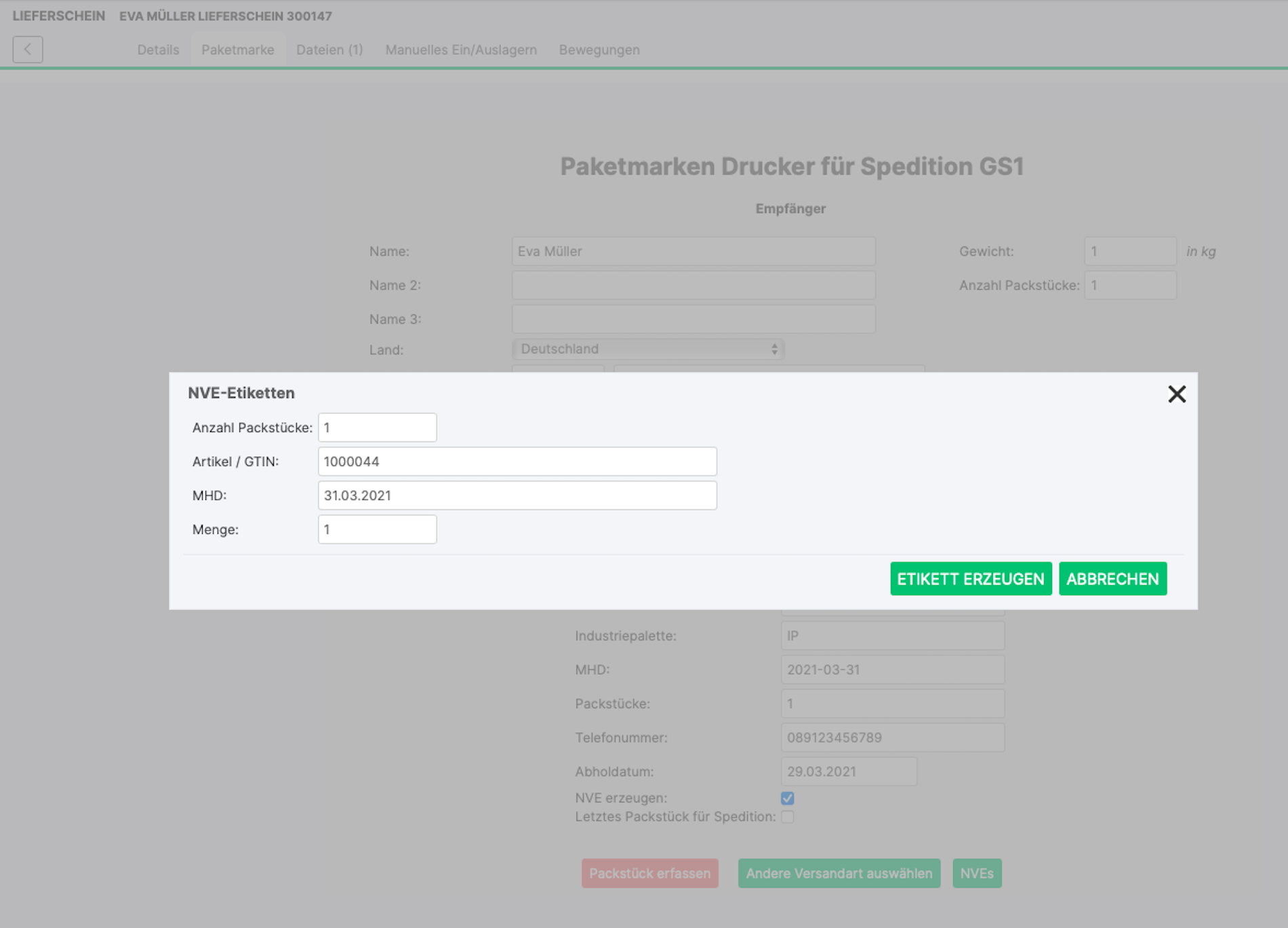 Du kannst ein individuelles Label für Packstücke mit Sendungs-/ NVE-Nummer und Freifeldern erstellen. Diese können mithilfe der Versandart Spedition im Tab Versandlabel des Lieferscheins erstellt werden.