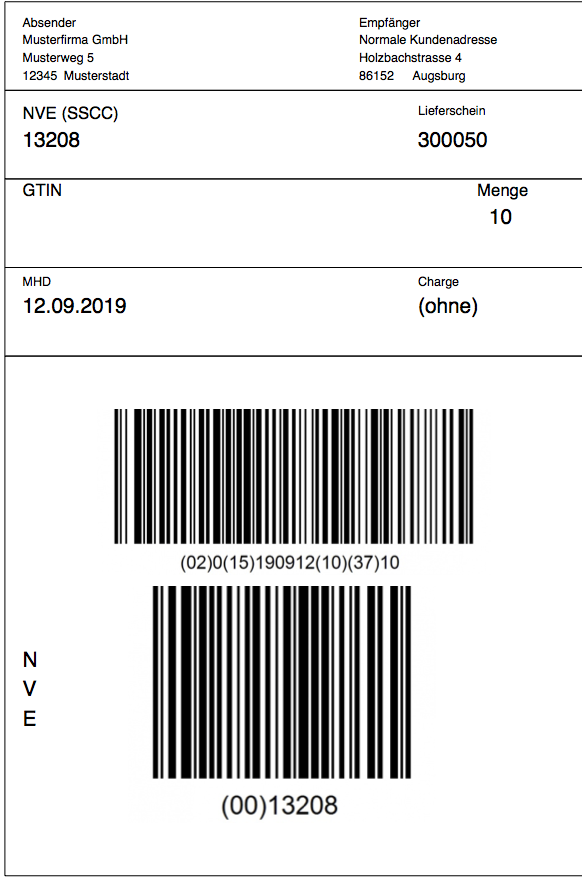 Das gedruckte Versandlabel (in diesem Fall mit Angabe des Mindesthaltbarkeitsdatums) kann beispielhaft so aussehen:
