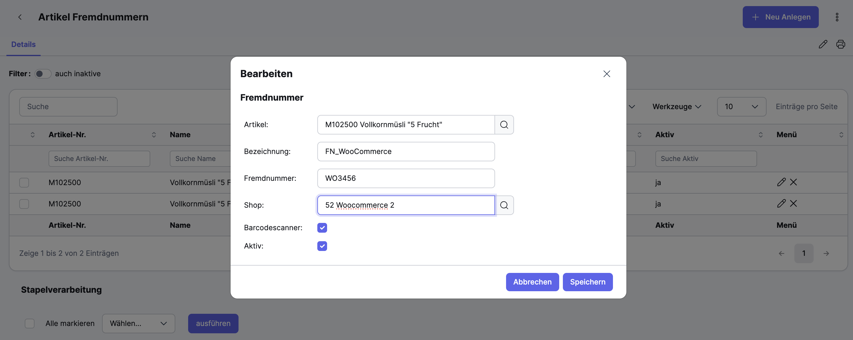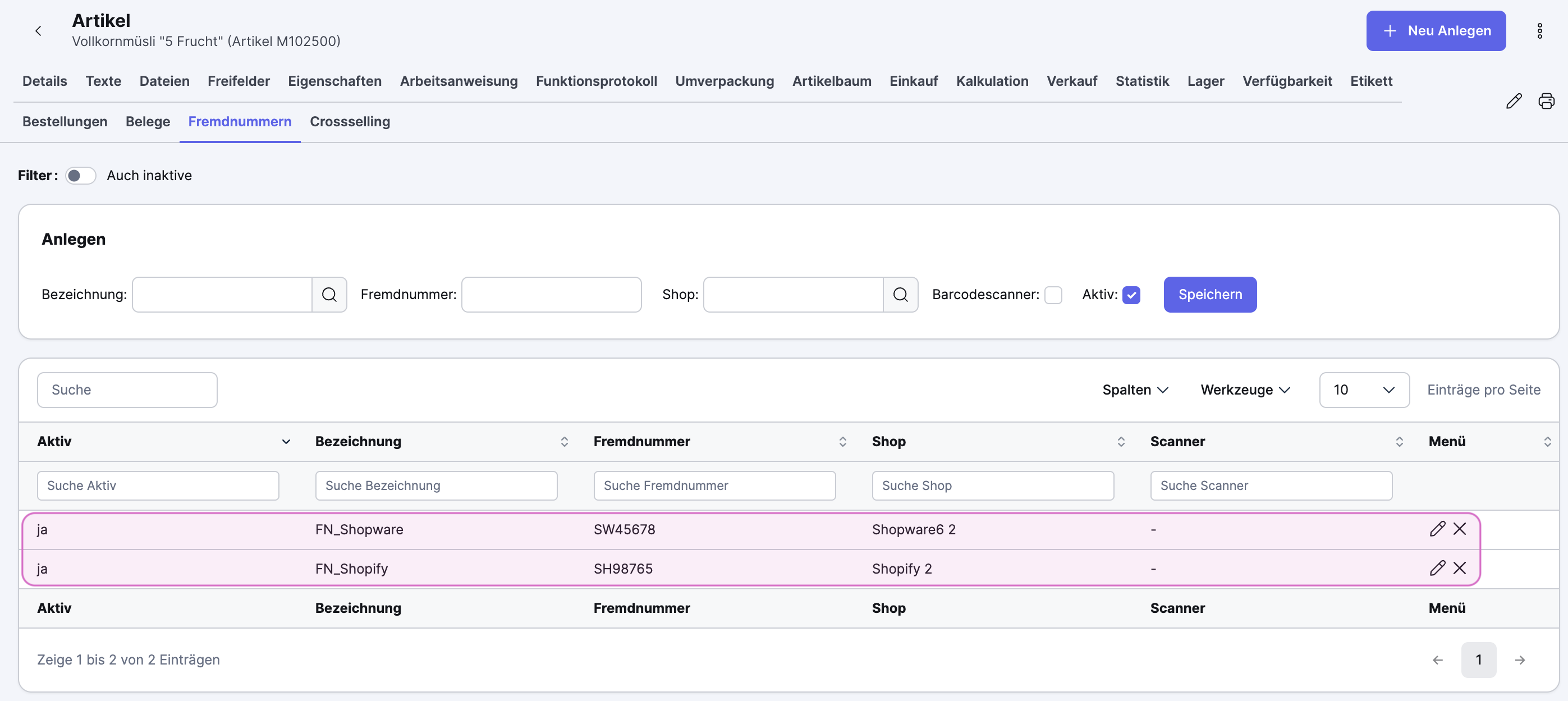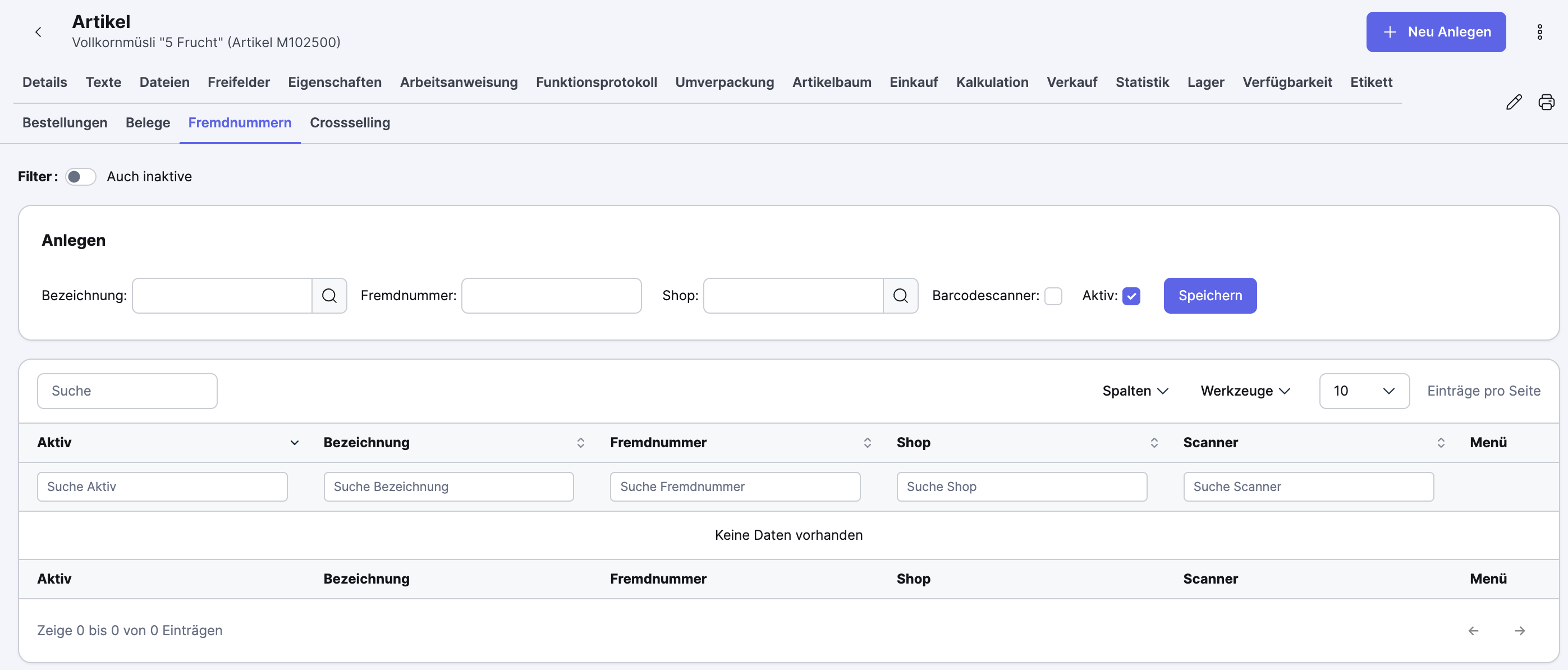 Um Fremdnummern einzutragen, öffne den Artikel im Xentral Artikelstamm und wechsele zum Reiter Fremdnummern: