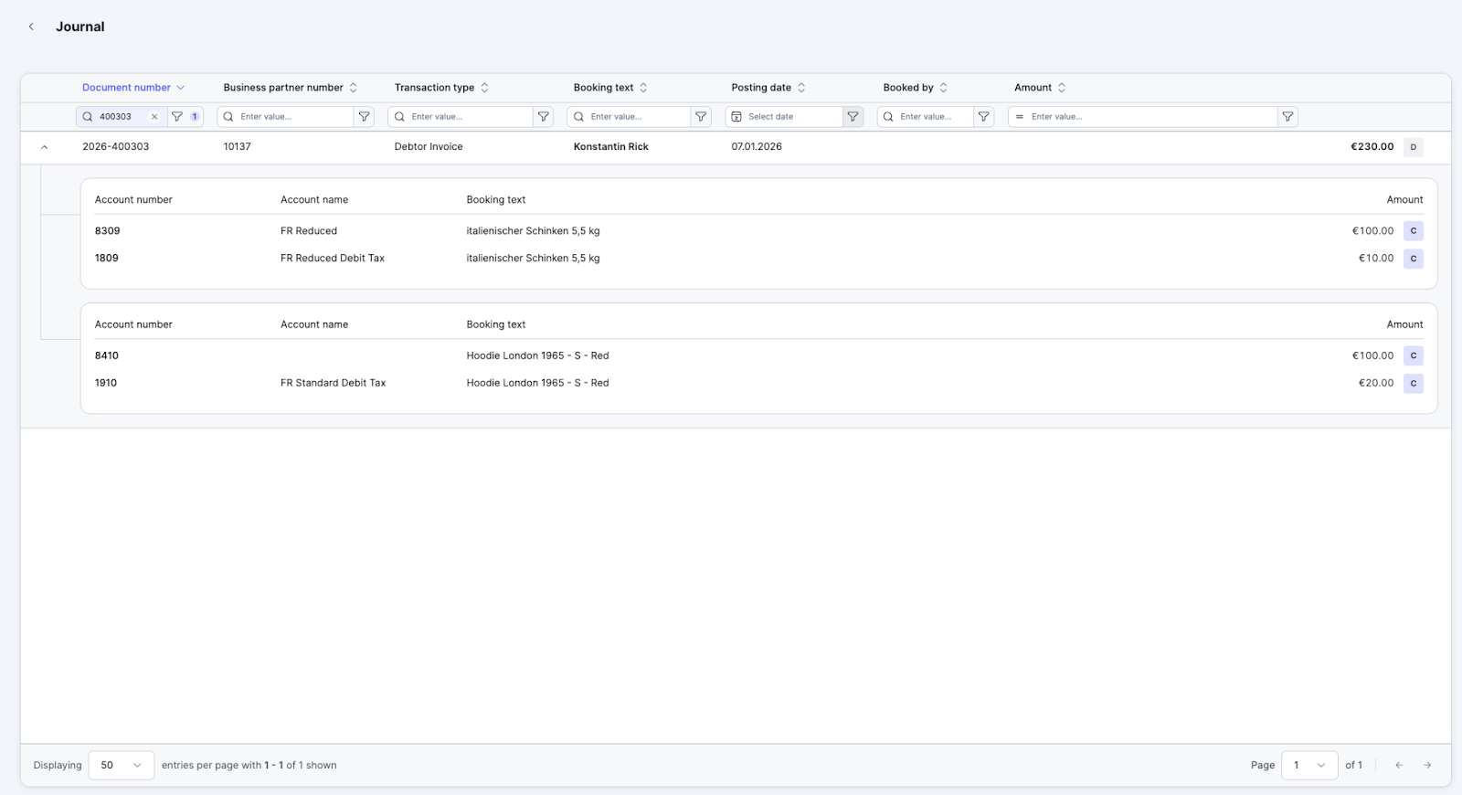 Wenn diese Transaktionen ins Journal übernommen werden, prüft das Xentral General Ledger die Beträge erneut und ordnet die passenden Steuer- und Erlöskonten zu.