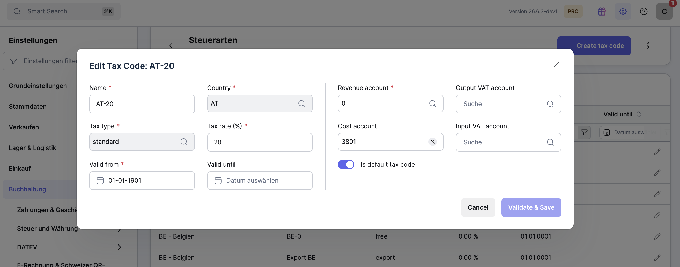 Es dürfen keine zwei Steuercodes mit denselben Angaben zu Land und Steuerart gleichzeitig gültig sein. Setze deshalb beim alten Steuercode das Feld „Gültig bis“ auf einen Tag vor dem Datum, an dem der neue Steuercode gültig wird.