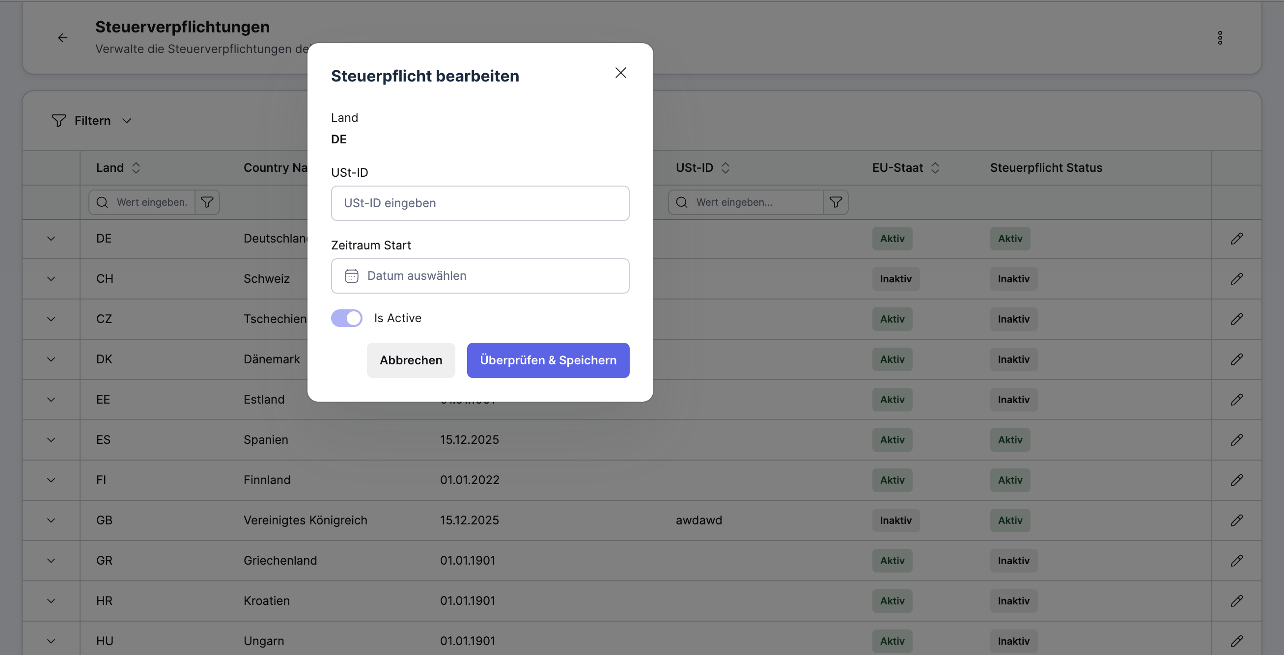Im Hintergrund erstellt Xentral automatisch einen neuen Zeitraum. Ab diesem Zeitpunkt erfolgt die Steuerberechnung für Transaktionen nach den lokalen Regeln des jeweiligen Landes.