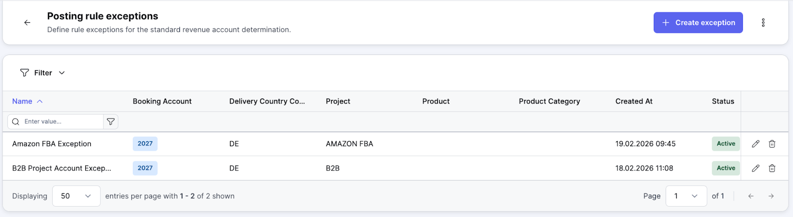 Neue Ausnahme für Erlöskonten (Revenue Account Exception): Zentrale Verwaltung aller Erlöskonten-Ausnahmen in einer gemeinsamen Übersicht mit Suchfunktion, aktivierbaren/deaktivierbaren Regeln sowie eindeutiger Benennung und einfacher Löschmöglichkeit.
