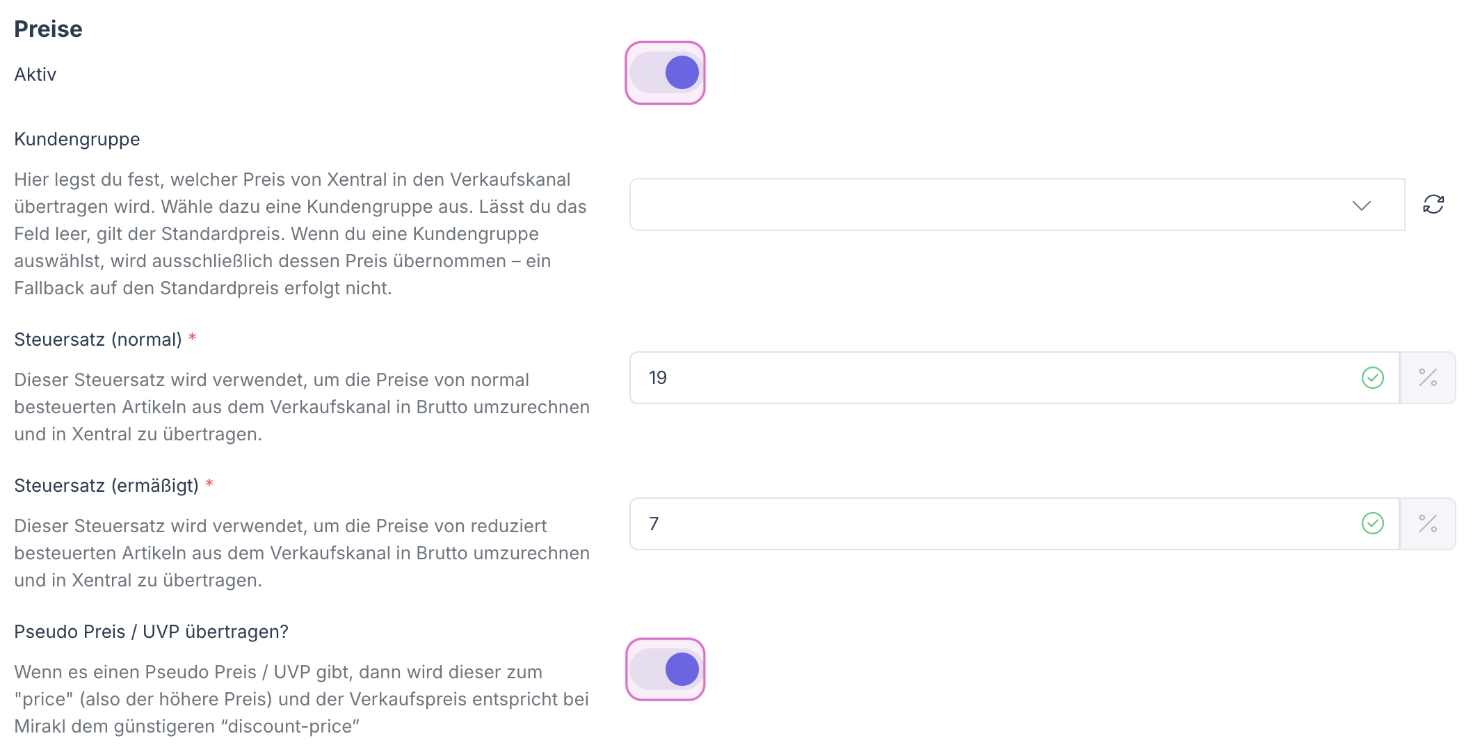 Pseudo Preis / UVP: Hier kannst du einen unverbindlichen Verkaufspreis (brutto) hinterlegen, der an den Marktplatz übermittelt wird.