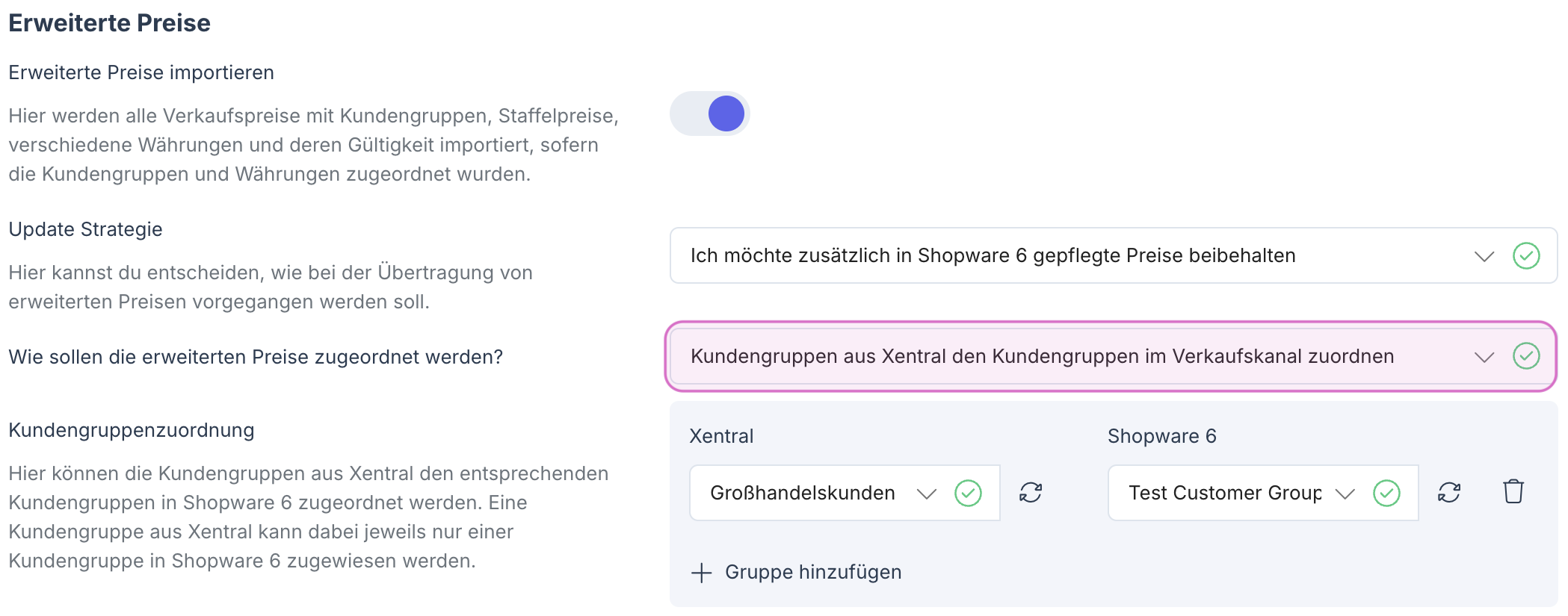 Voraussetzung: Die entsprechende Kundengruppe muss in Shopware bereits existieren (unter Einstellungen > Kundengruppe).