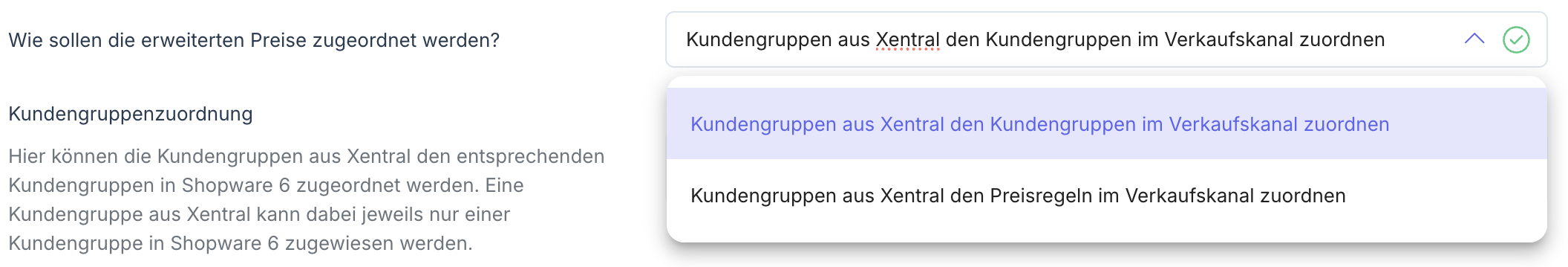 Wähle bei der Zuordnung die erste Option: Kundengruppen aus Xentral den Kundengruppen im Verkaufskanal zuordnen.