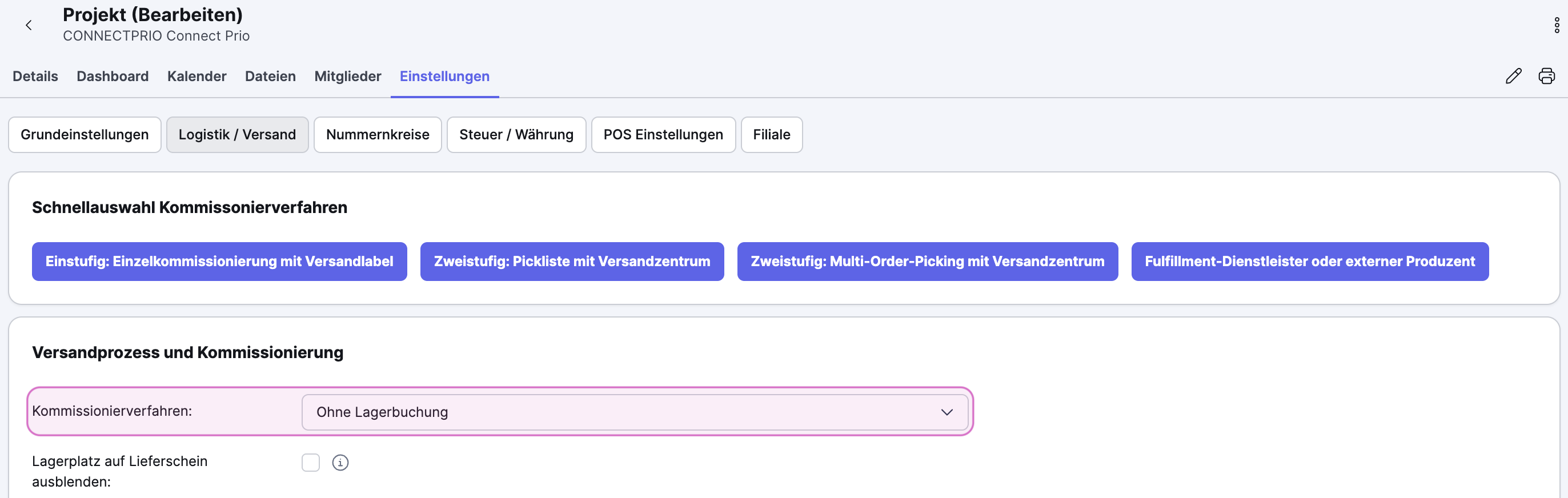 FBA Aufträge benötigen keinen Logistikprozess (Lieferschein), da sie direkt von Amazon versendet werden. Das gilt unabhängig davon, welches Handling du für deine Rechnungserstellung nutzt. Wähle beim Kommissionierverfahren in deinem FBA-Projekt "Ohne Lagerbuchung":