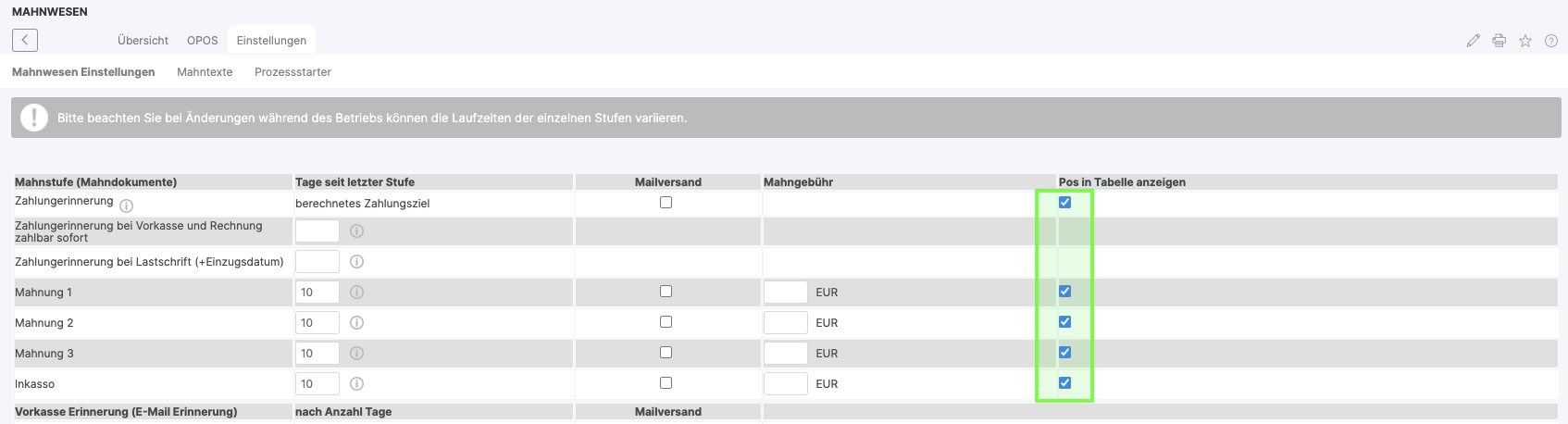 In der Offenen Posten Liste werden im Mahnwesen alle offenen/teilbezahlten Rechnungen unabhängig von der Mahnstufe angezeigt: