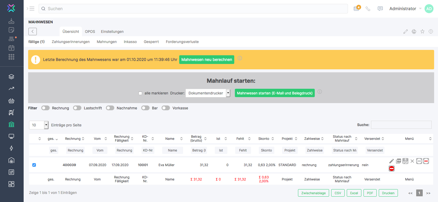 Im Mahnwesen selbst sammeln sich die aktuell fälligen Rechnungen an. Hat dein Kunde vollständig bezahlt, erscheint der Eintrag dort nicht mehr.