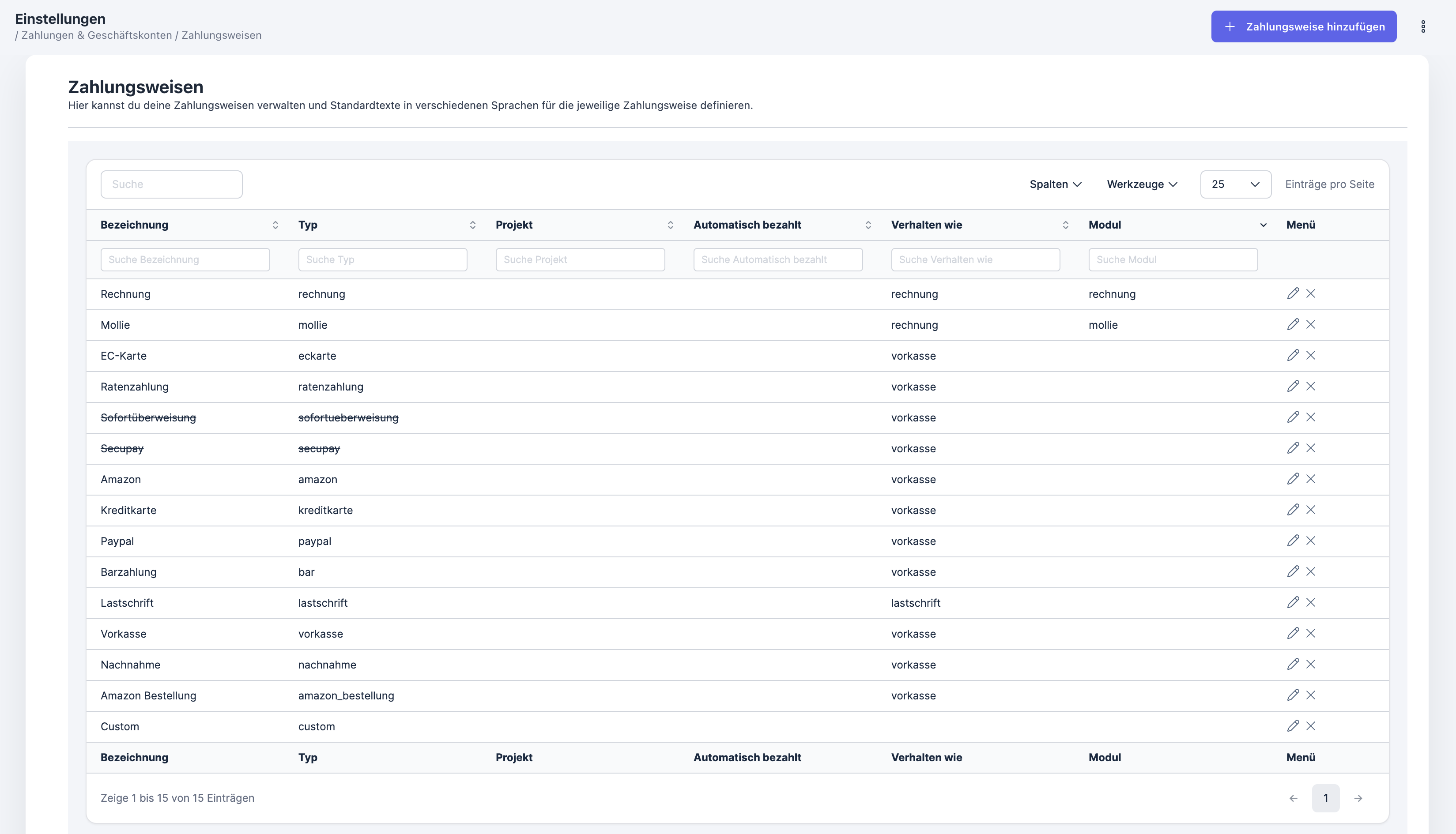 Vermeide Doppelungen zu bereits bestehenden Zahlungsweisen in Bezeichnung und Typ. Ein Modul kann auch mehrfach verwendet werden.