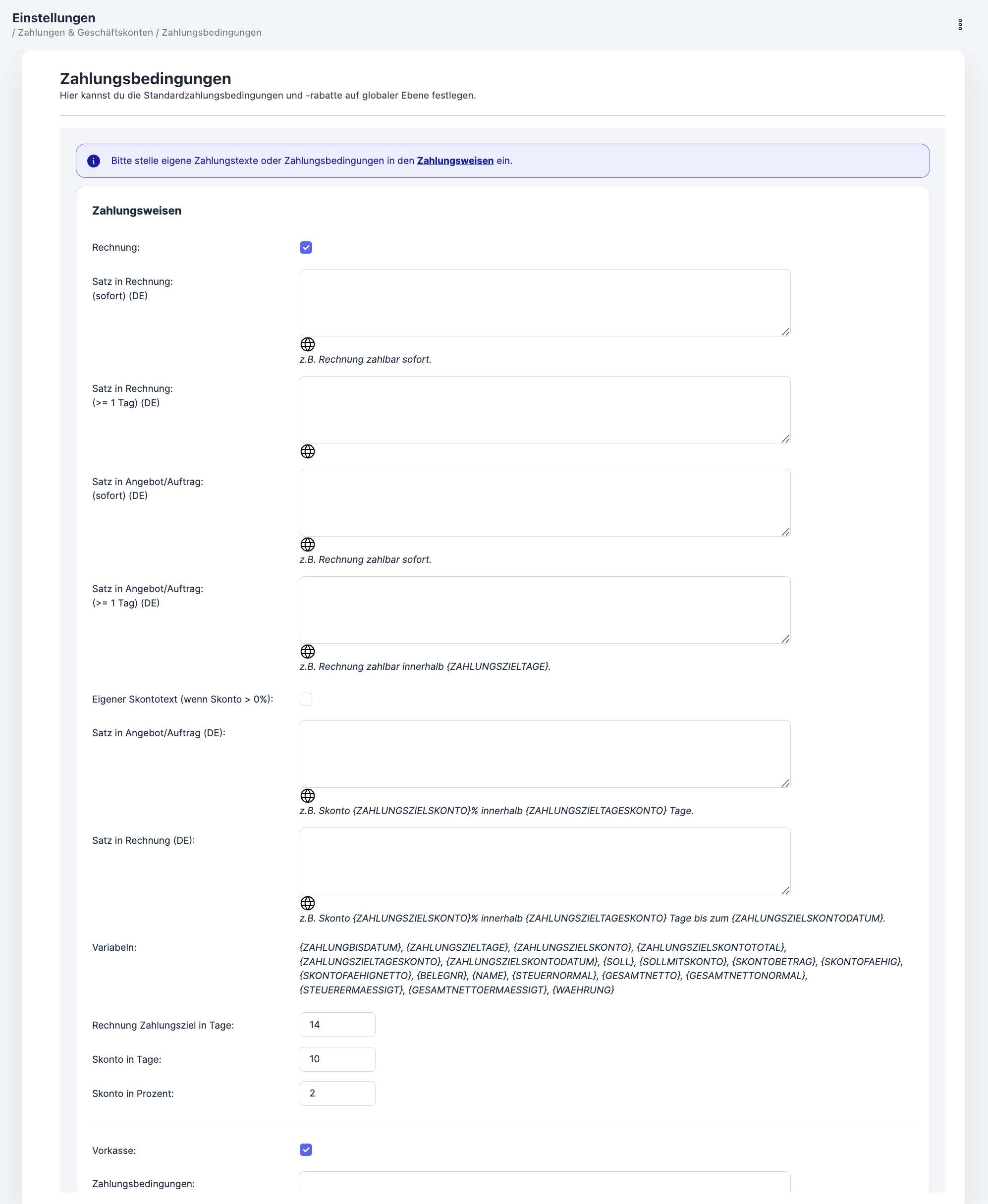 Gib deinen Text und auch Variablen ein. Den Hinweissatz für einen Skontobetrag größer als 0% kannst du separat eingeben und steuern für Angebot/Auftrag und Rechnung.