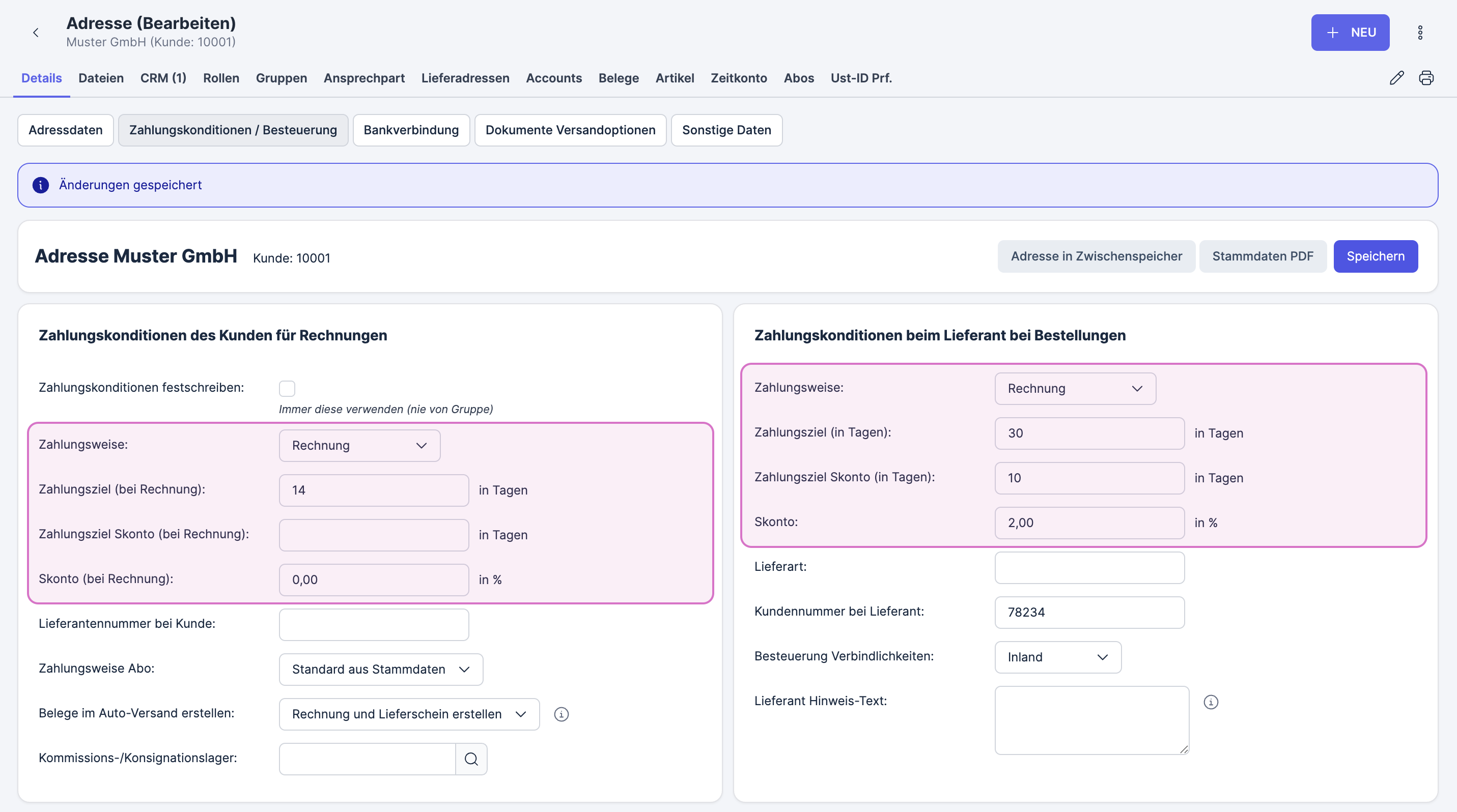 Du kannst sie direkt in Belegen, in Kunden- oder Lieferantenadressen sowie in Projekten hinterlegen, damit Zahlungsziele, Skonto und weitere Konditionen automatisch übernommen werden.