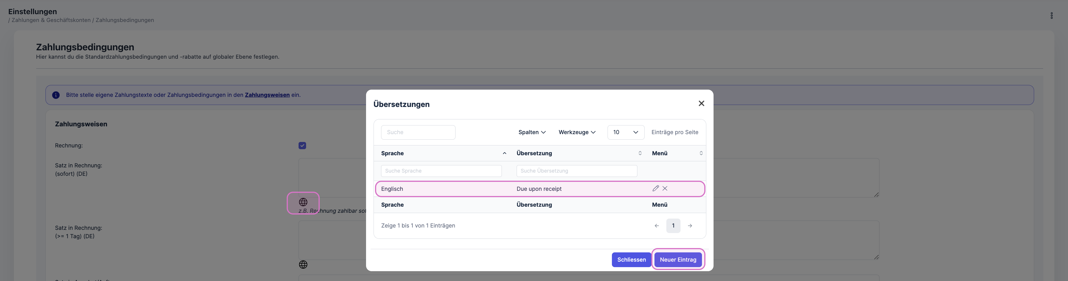 Anlegen individueller Zahlungsweisen und deren Verhaltensweise.