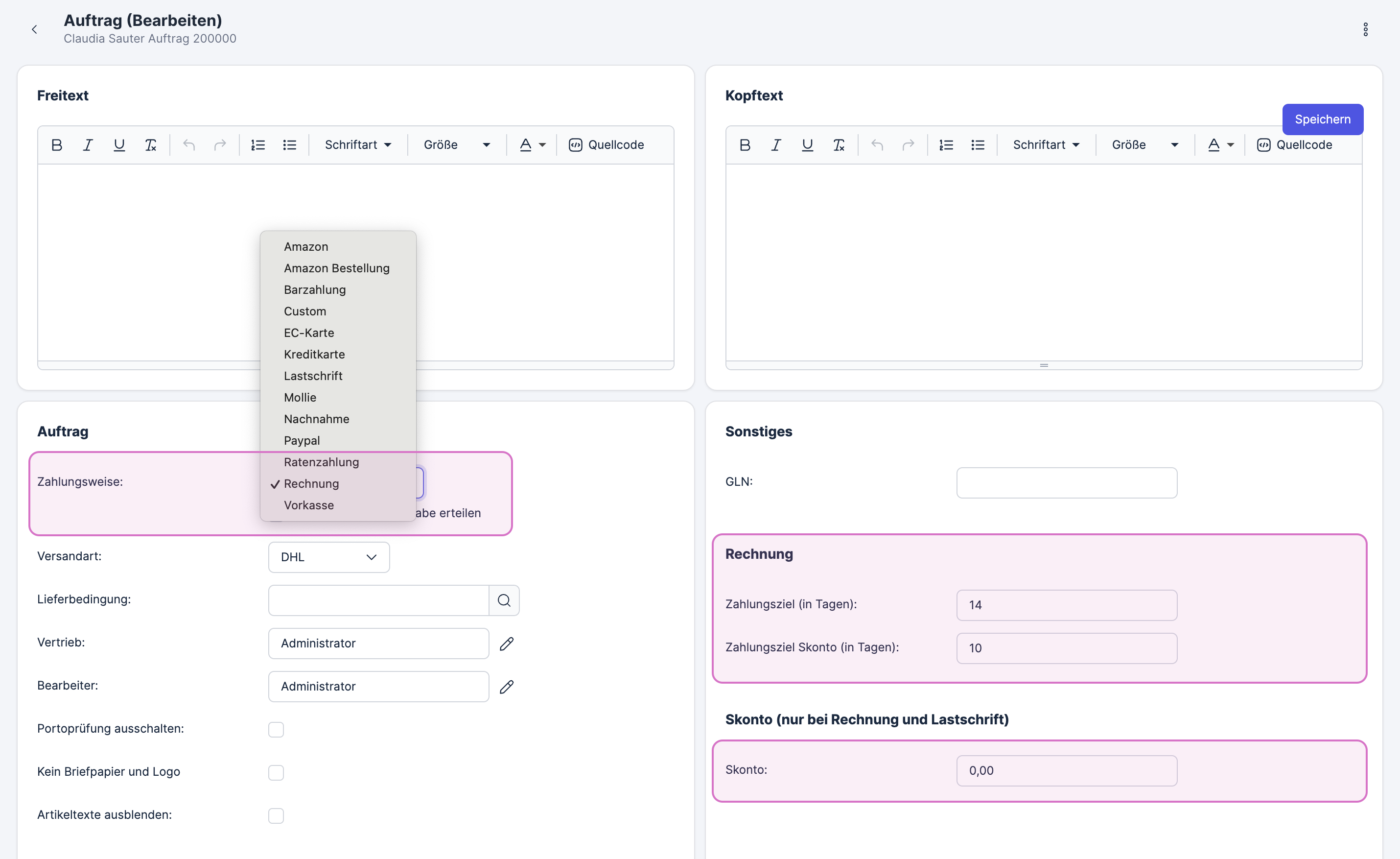 Legst du einen neuen Auftrag aus einer Kundenadresse an, wird automatisch die dort hinterlegte Zahlungsweise übernommen.