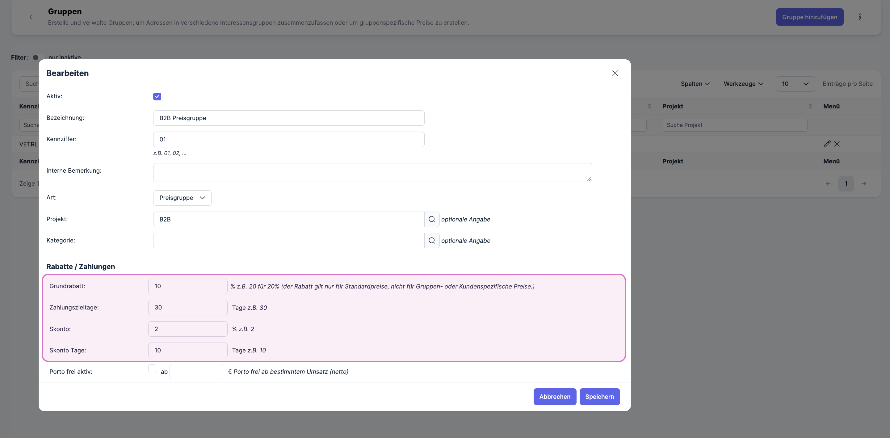 Eine Zahlungsweise kann in einer Preisgruppe eingegeben werden.