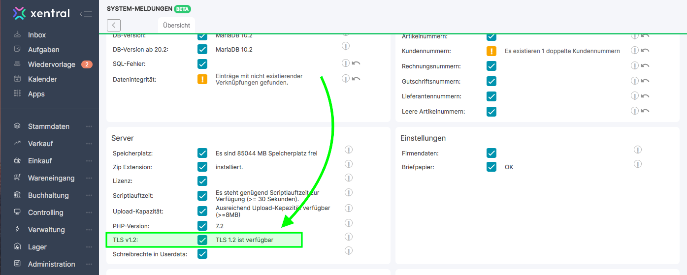 In der System Health-Übersicht findest du im Bereich “Server” den Check für TLS v1.2: