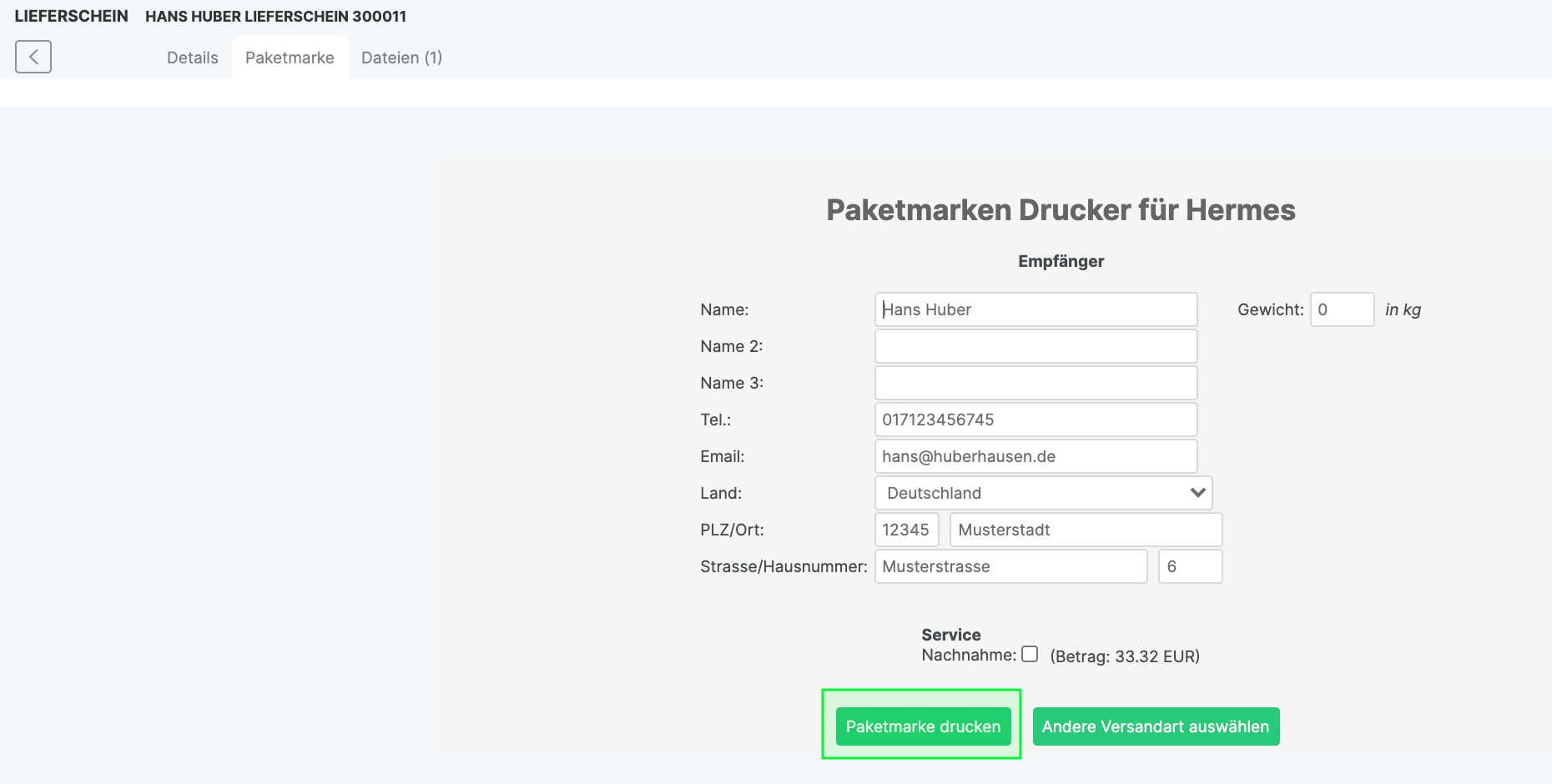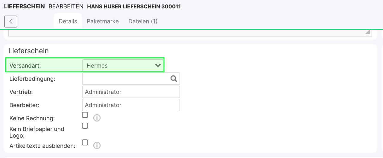 Sobald du alle Einstellungen wie oben beschrieben vorgenommen hast, kannst du den Paketmarkendruck im Versandzentrum oder auch in einem einzelnen Lieferschein testen. Wähle dazu im Lieferschein im Reiter "Lieferschein" die Versandart "Hermes" aus dem Drop-Down Menü aus: