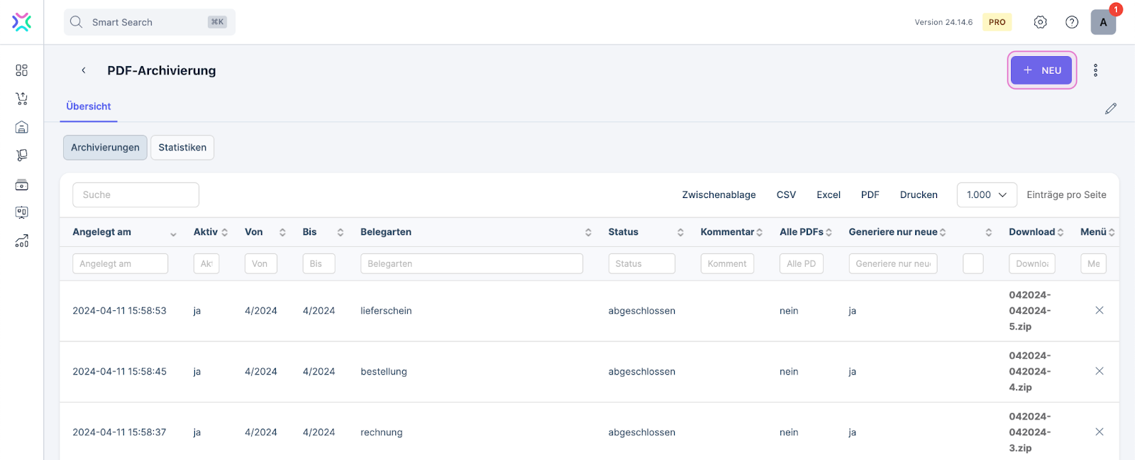 Im Tab Übersicht des Moduls PDF-Archivierung findest du später alle bereits durchgeführten PDF-Archivierungen.