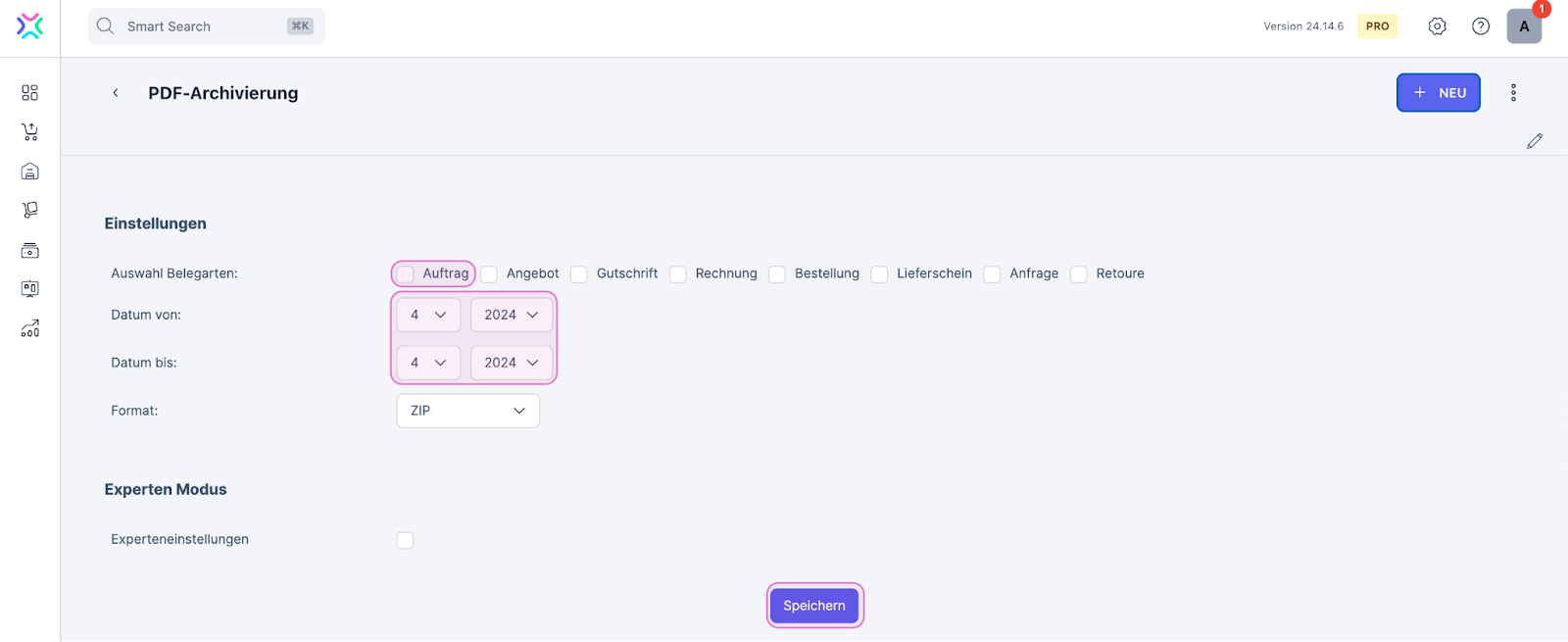 Klicke oben rechts auf Neu anlegen, um eine neue PDF-Archivierung anzulegen.