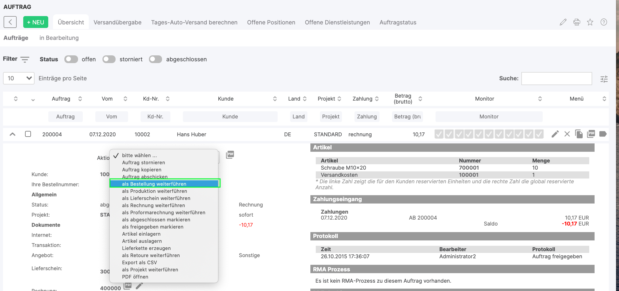 Der Auftrag wird direkt über das Aktions-Menü im Mini-Detail zur Bestellung weitergeführt: