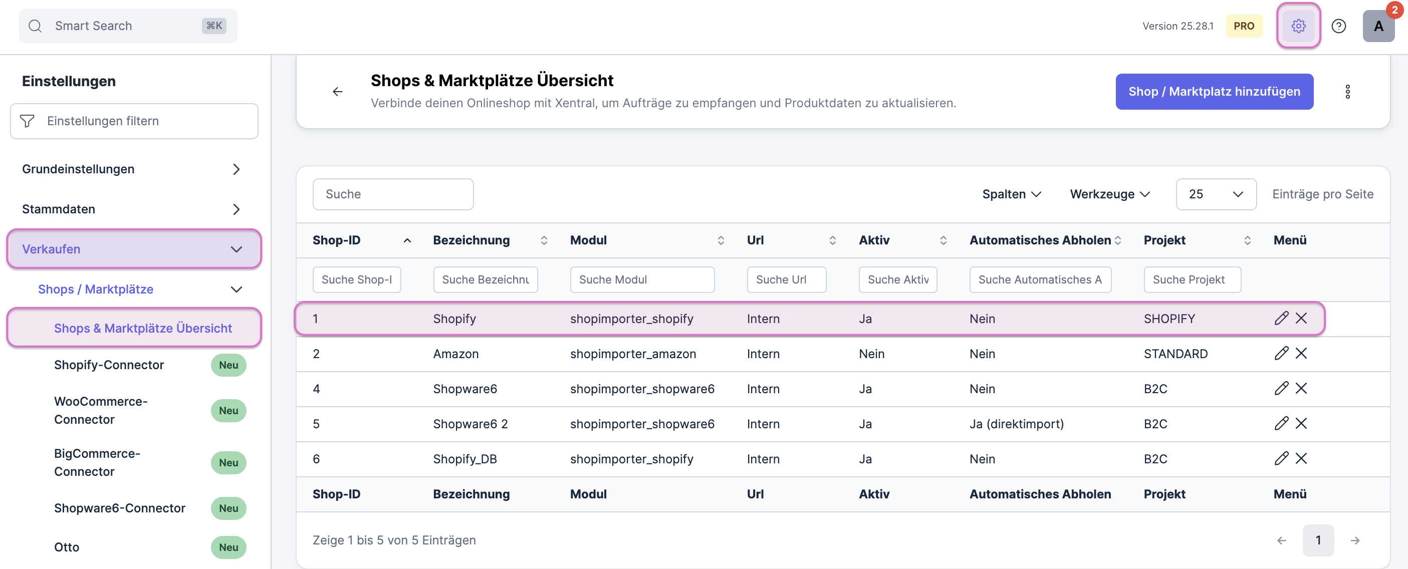 Öffne das Menü Einstellungen > Verkaufen > Shops / Marktplätze > Shops & Marktplätze Übersicht.