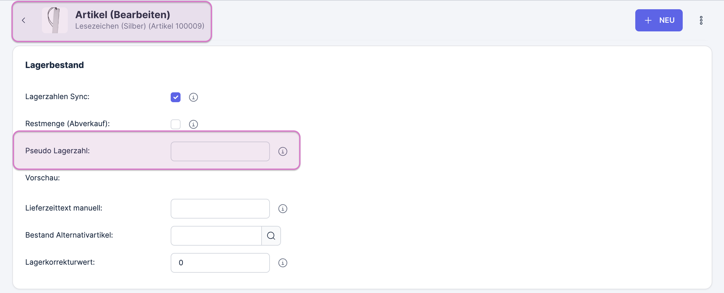 In den Artikelstammdaten: Nutze diese Vorgehensweise, wenn du für bestimmte Artikel abweichende Bestandszahlen auf all deinen Verkaufsplattformen anzeigen möchtest.