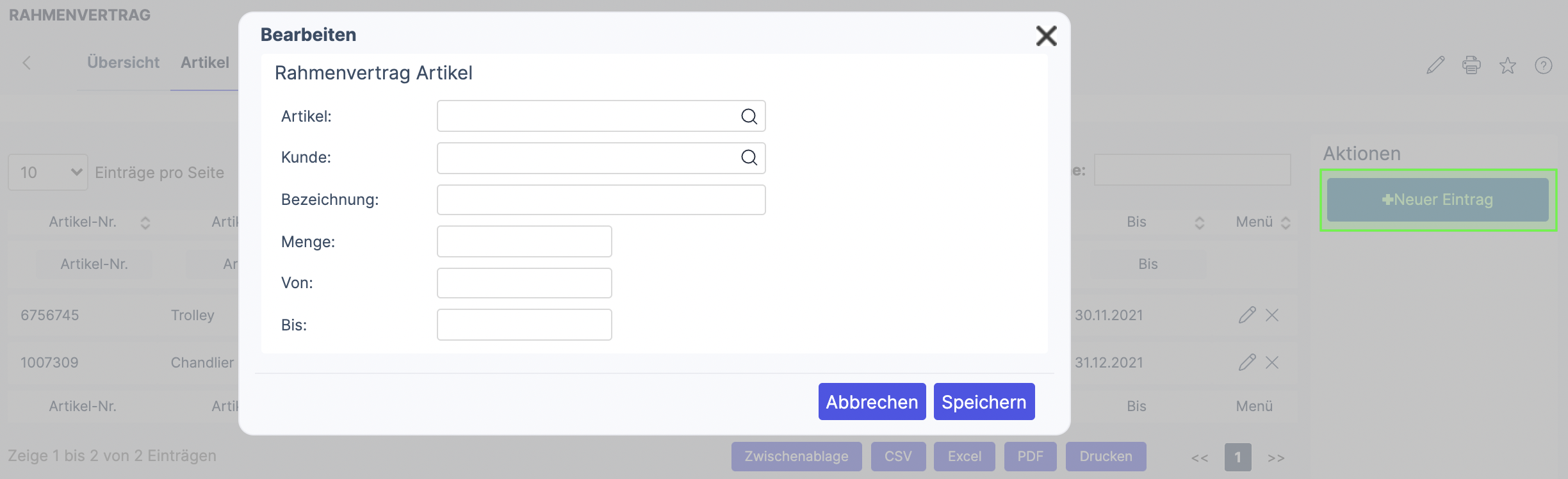 Hier kannst du im Reiter Artikel über den Button +Neuer Eintrag einen neuen Rahmenvertrag für einen Kunden festlegen.
