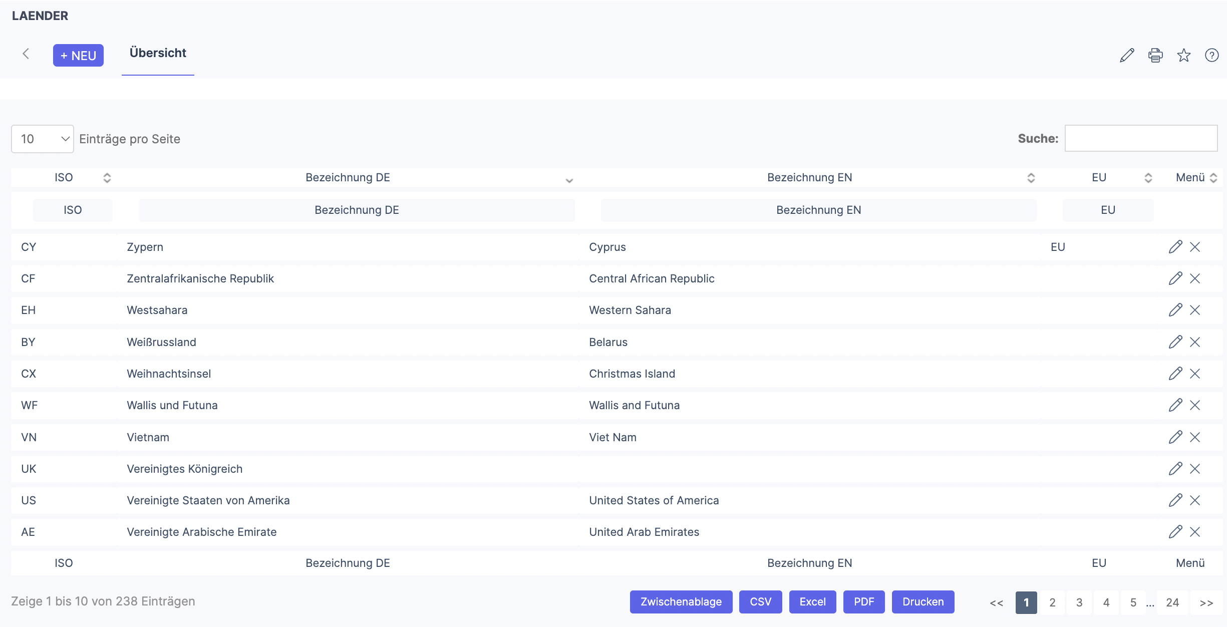 Ein neues Land kann über den Button +NEU hinzugefügt werden (es sollte vorher über die Suchfunktion geprüft werden, ob das Land bereits vorhanden ist).