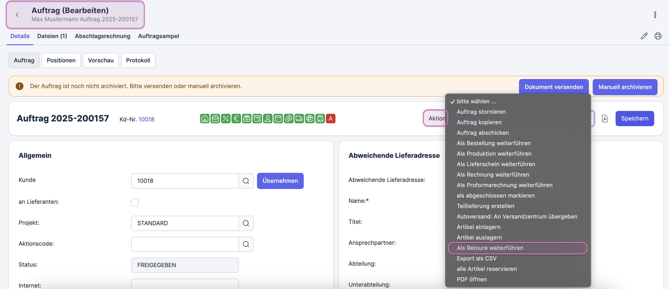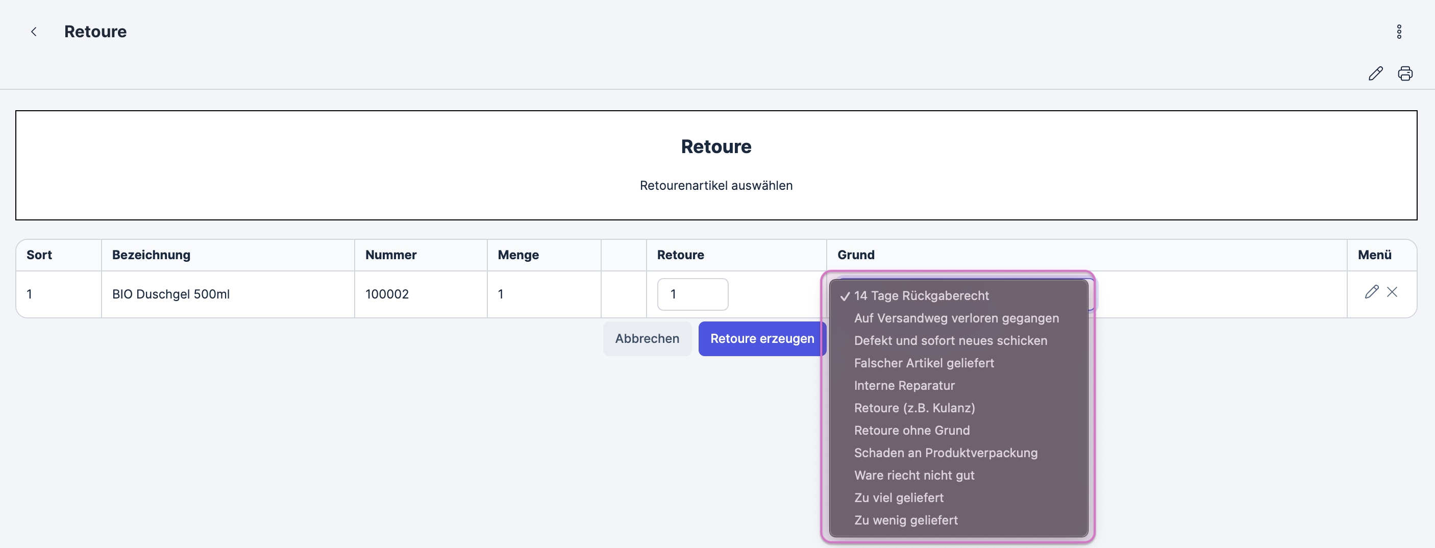 Der neue Retourengrund wird erstellt und steht anschließend zur Auswahl zur Verfügung, wenn du im Menü Verkaufen > Auftrag > Auftrag öffnen > Aktionsmenü eine Retoure anlegst.