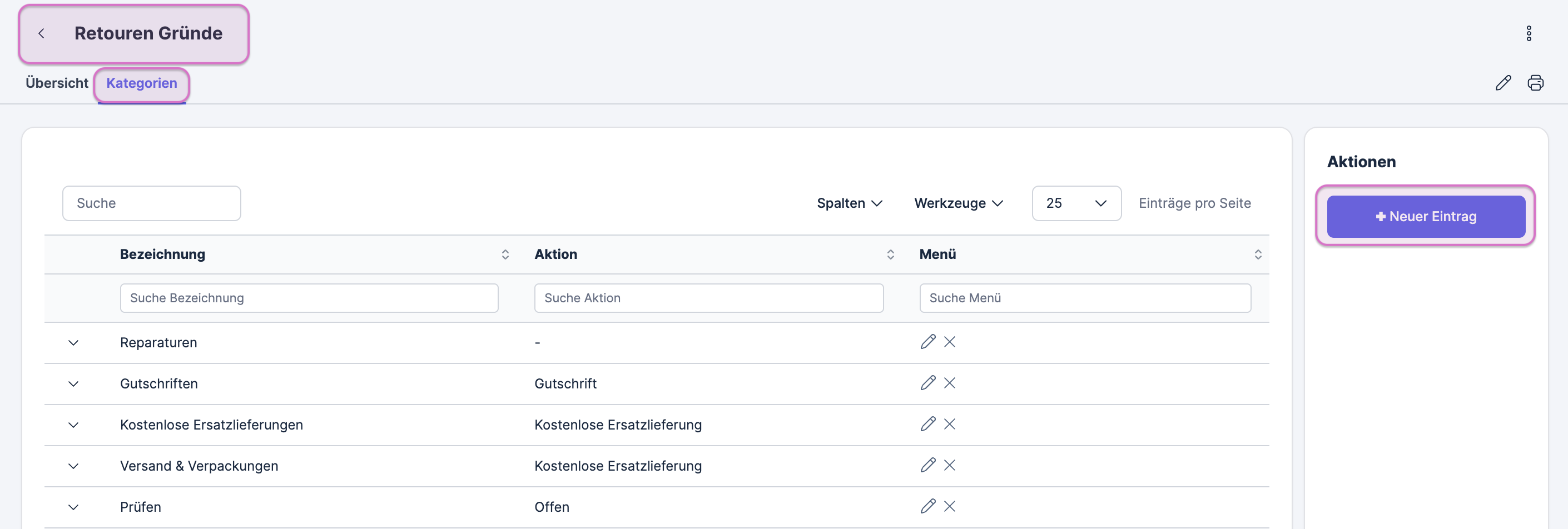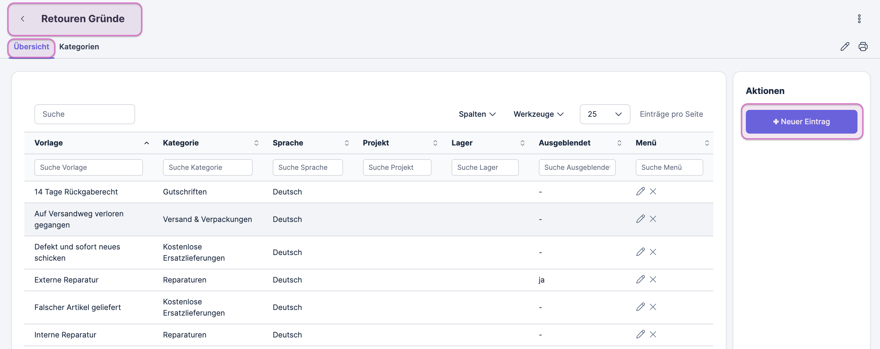 Klicke oben rechts auf +Neuer Eintrag, um einen neuen Retourengrund anzulegen.