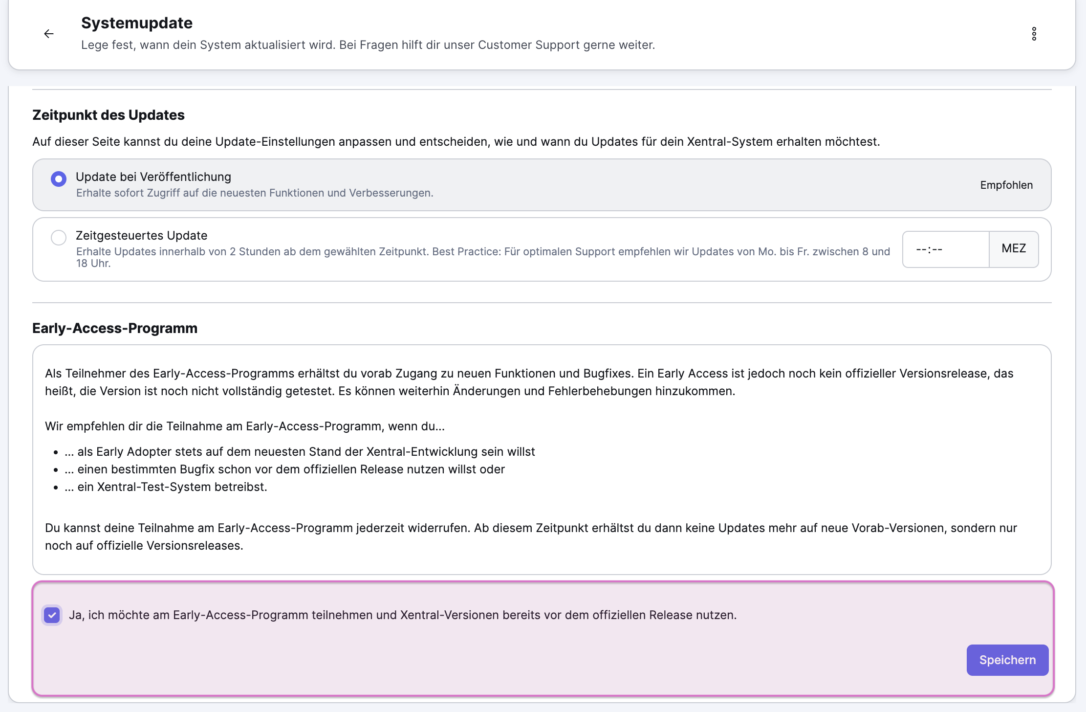 Aktiviere die Option Ja, ich möchte am Early-Access-Programm teilnehmen und Xentral-Versionen bereits vor dem offiziellen Release zu nutzen.