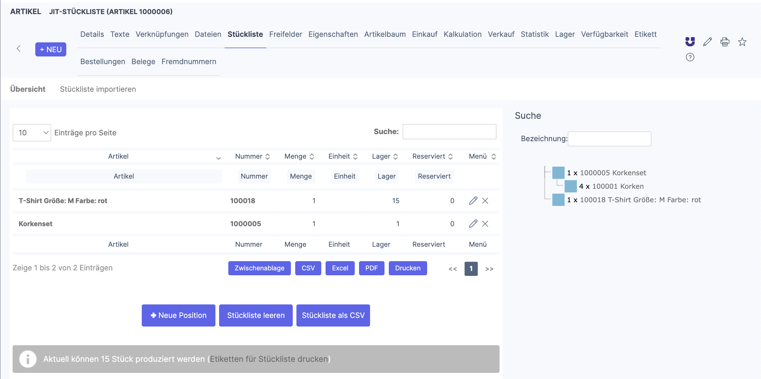Füge der Stückliste die Artikel hinzu, die sich auch in deiner JIT-Stückliste befinden, die vorproduziert werden soll (siehe Abschnitt Artikel zur Stückliste hinzufügen).