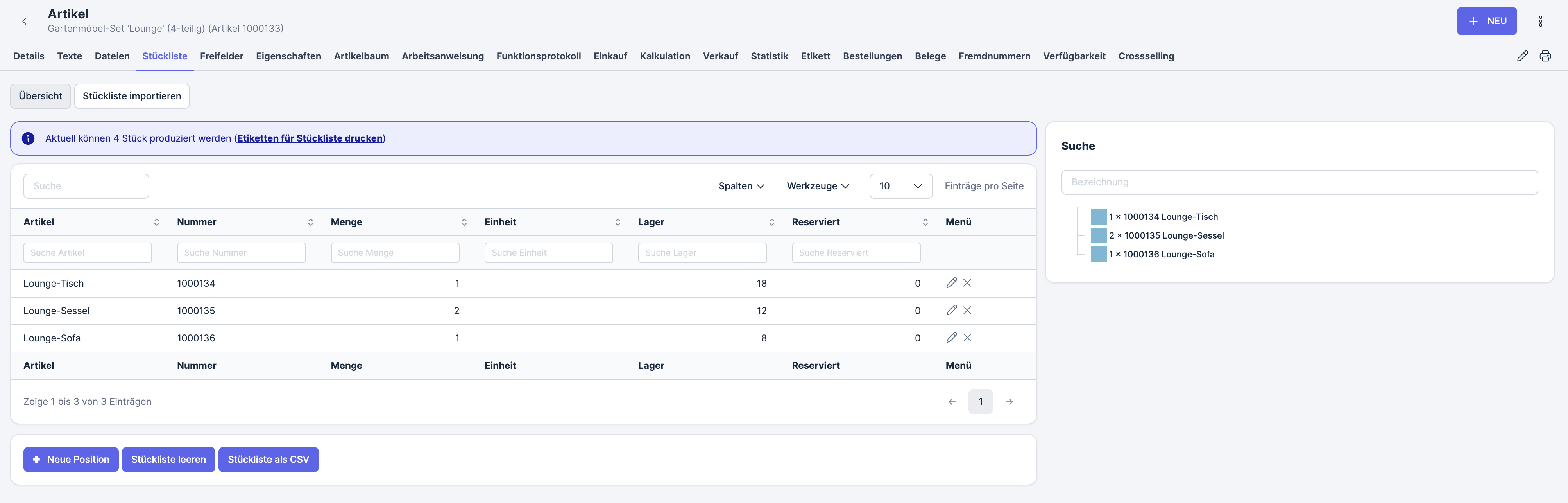 Ein Garten-Lounge-Stuhlset mit Kissen besteht aus einem Gartenstuhl (Rahmen), einem Sitzkissen und einem Rückenkissen. Diese Komponenten werden nicht einzeln im Lager geführt, sondern als vollständiges Set eingelagert. Das Set hat eine eigene Artikelnummer und einen festen Lagerplatz, unter dem es im System verwaltet wird.