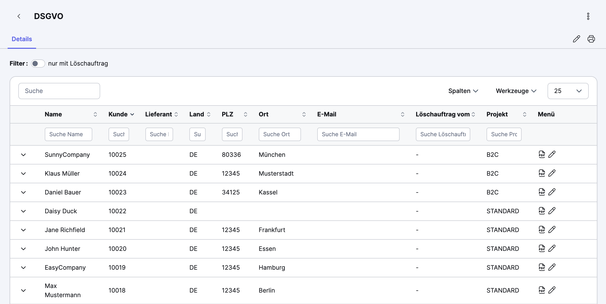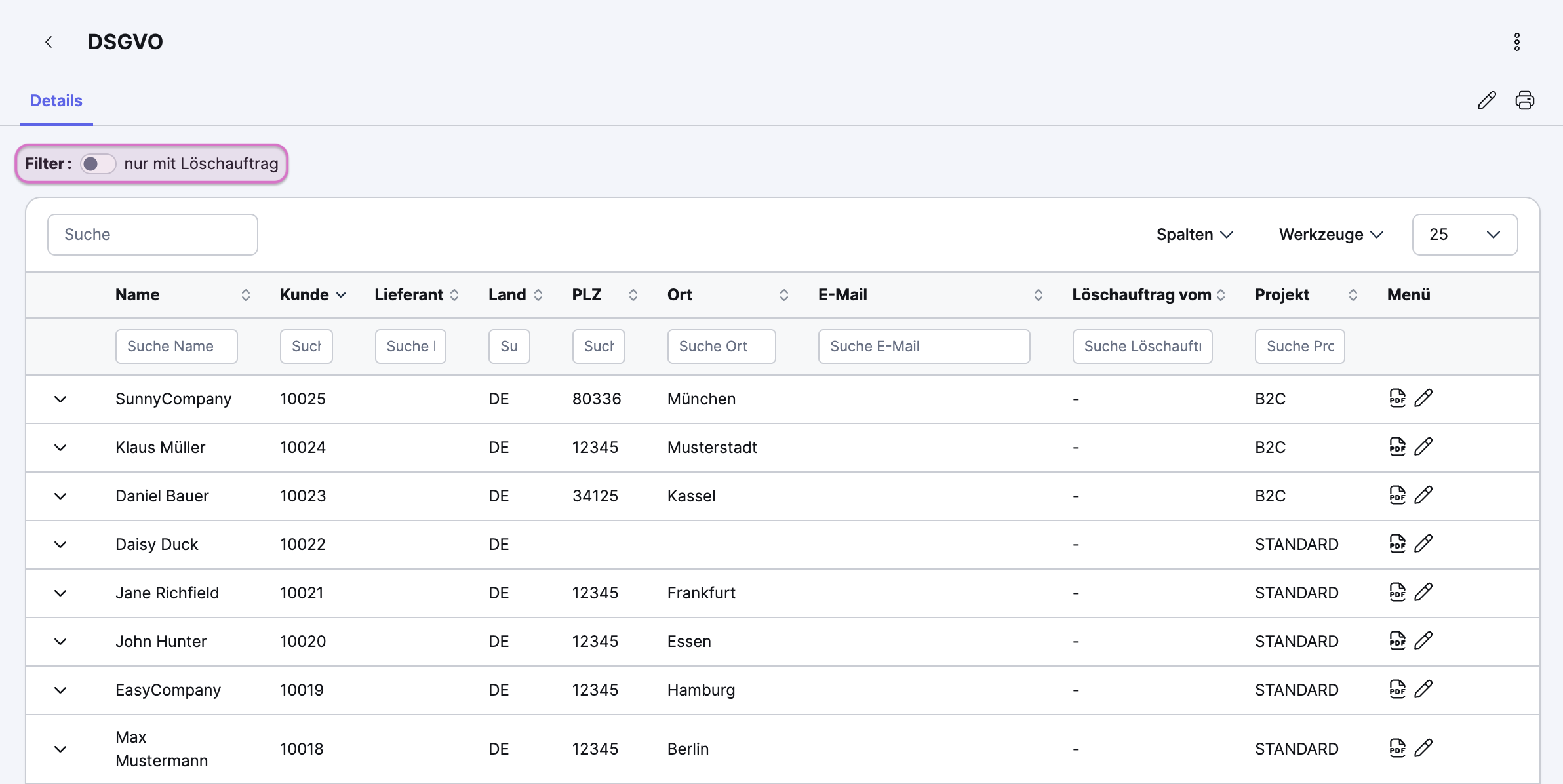 Im Tab Details des Moduls DSGVO siehst du eine Auflistung aller Adressen, die in Xentral gespeichert sind.