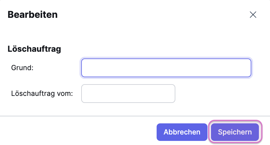 Im Popup, das anschließend angezeigt wird, gibst du den Grund für die Löschung und das Löschdatum an. Klicke auf Speichern, um die Adresse zur Löschung zu markieren.
