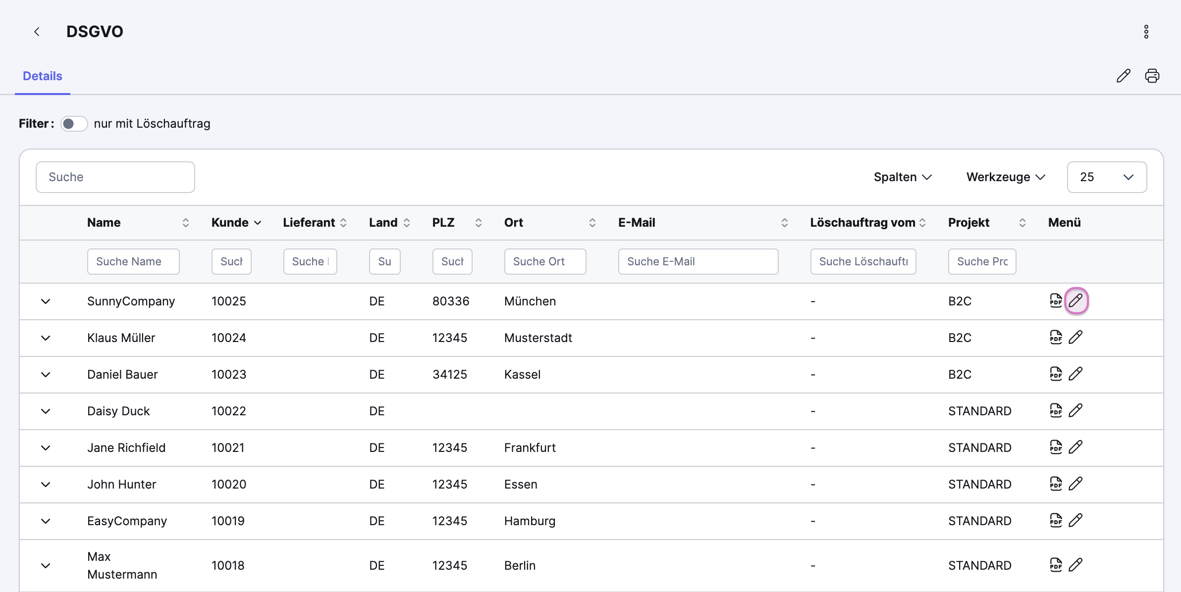 Wenn dich ein Kunde kontaktiert und die Löschung seiner Adresse wünscht, kannst du diese in der Übersicht zur Löschung markieren, indem du auf das Stift-Symbol rechts klickst.
