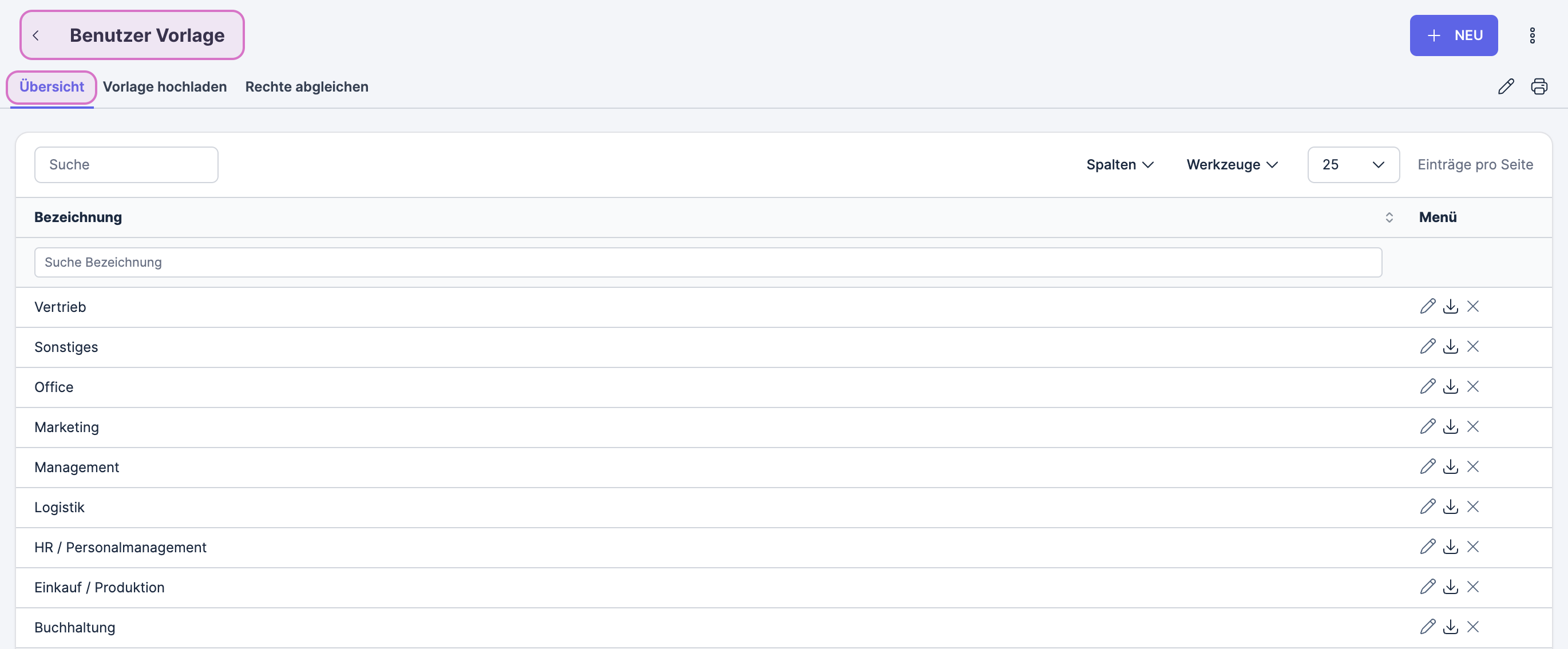 Das Modul Benutzer Vorlage kannst du ganz einfach über die Smart Search öffnen. Anschließend findest du im Tab Übersicht von Xentral vorgefertigte Benutzervorlagen. Später kannst du über die Übersicht auch deine selbst angelegten Benutzervorlagen einsehen und bei Bedarf bearbeiten.