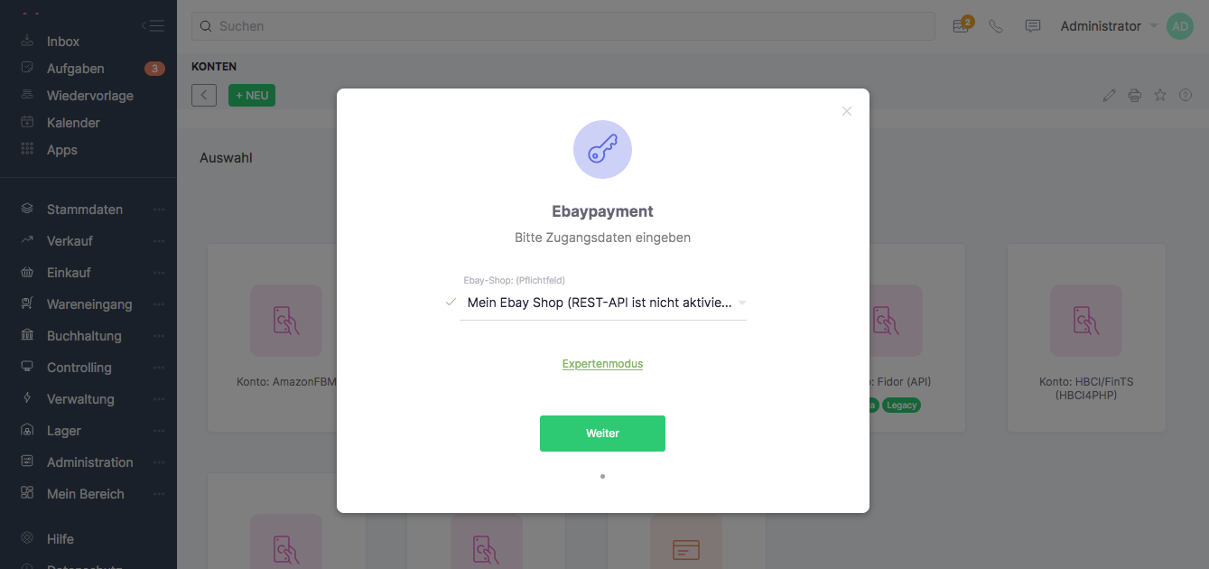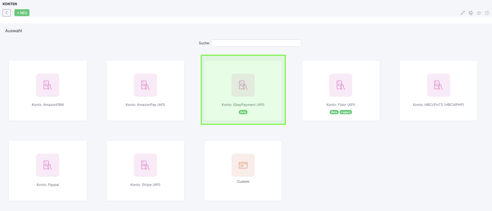 Typ → Typ des Kontos. Hier ist "Konto: Ebay Payment (API)" auszuwählen