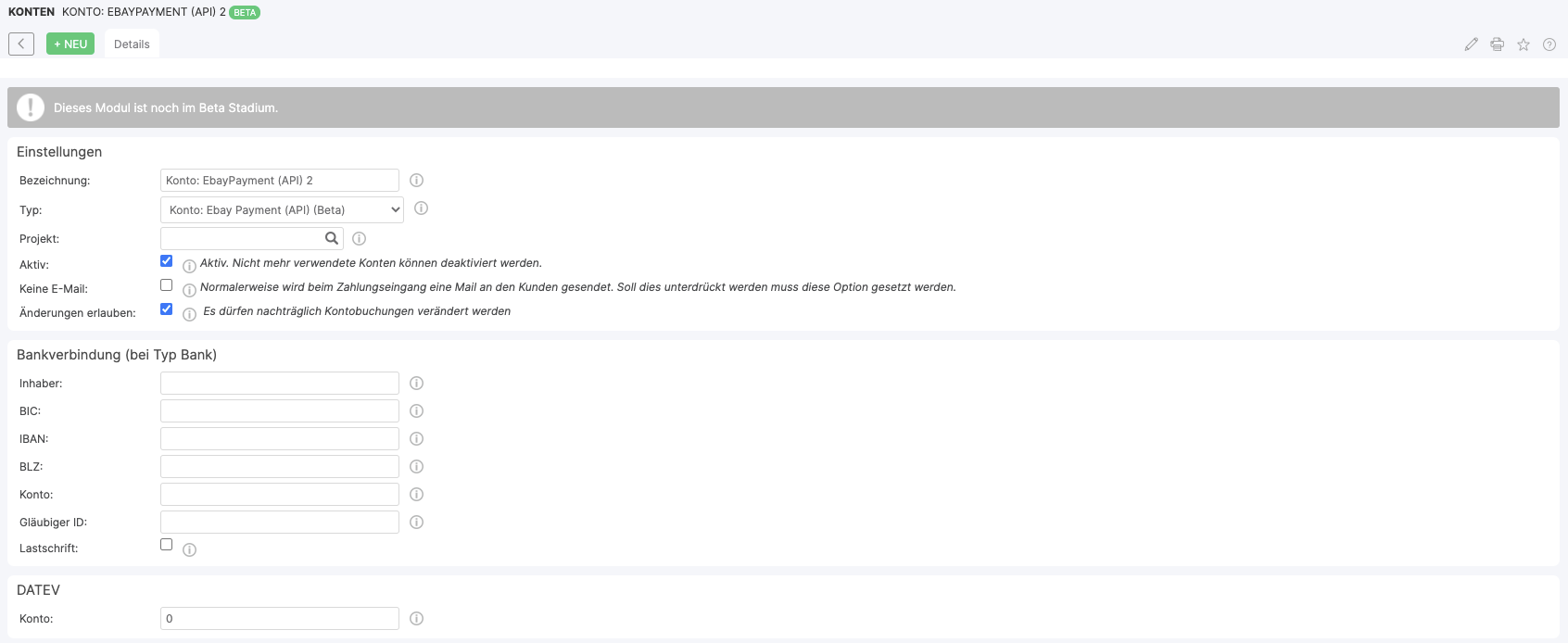Über den Button +NEU in der Kontenübersicht kann ein neues eBayPayment Konto angelegt werden. Wurde bereits ein Konto in xentral angelegt, so kann dieses über den Edit-Button bearbeitet werden.