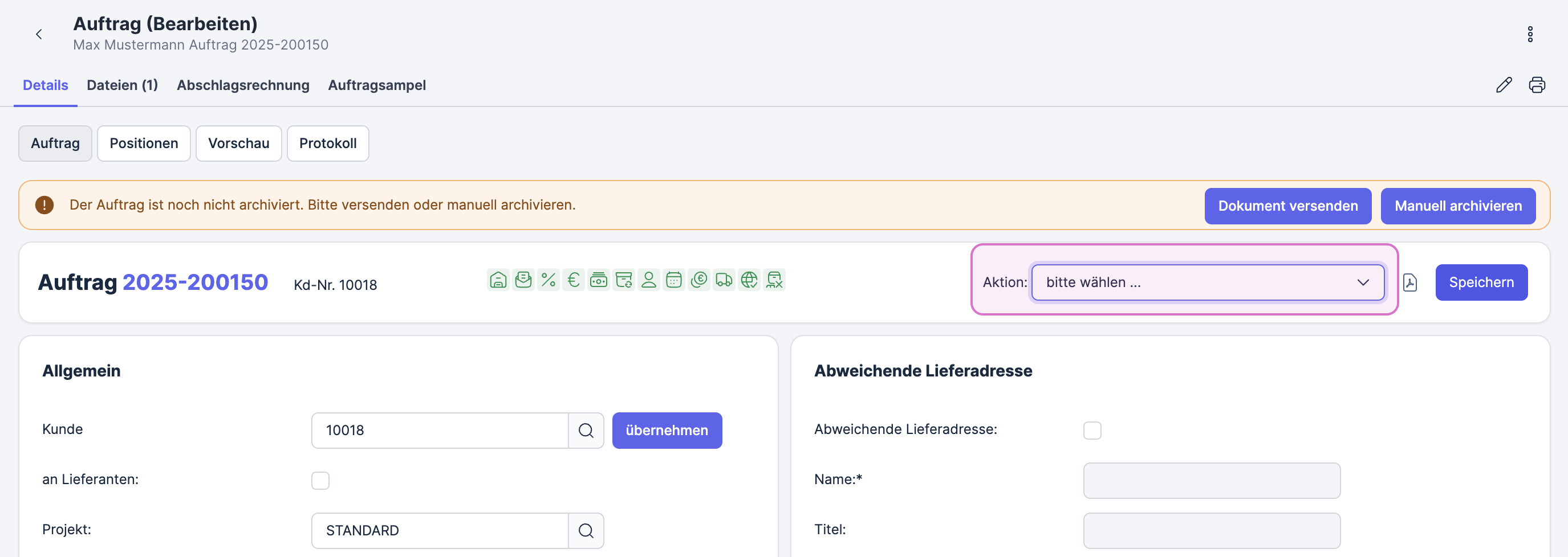 Öffne einen Auftrag, indem du in die Zeile des Auftrags klickst.
