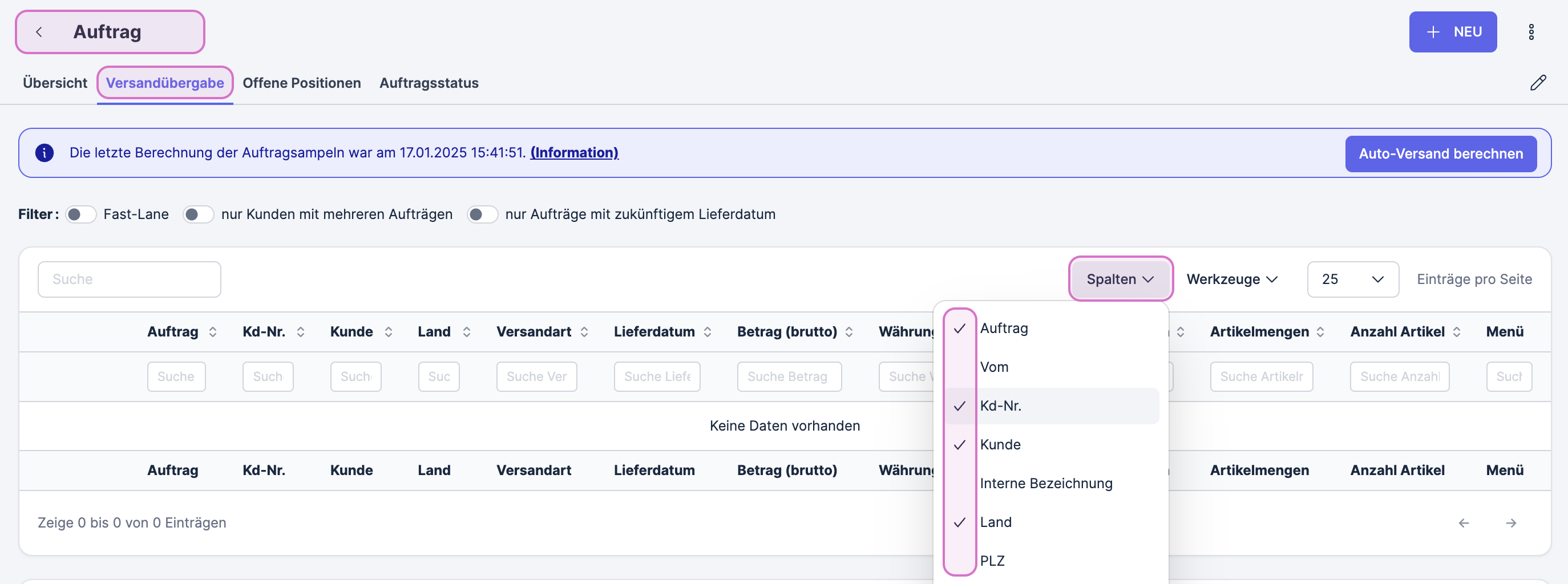 Öffne zunächst das Menü Verkauf > Auftrag > Tab: Versandübergabe. Hier findest du alle Aufträge, die bereit für den Auto-Versand sind. Füge nun die folgenden Schritte aus, um die angezeigten Informationen in der Auftragsübersicht anzupassen: