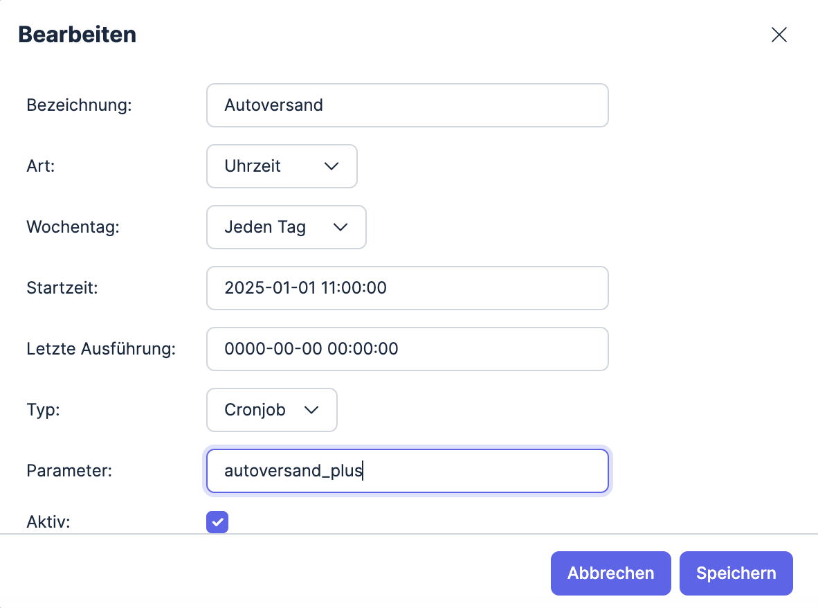 Wir empfehlen dir, in den Einstellungen des Prozesses autoversand_plus stets die Art Uhrzeit auszuwählen. Falls du die Art Periodisch verwendest, musste du darauf achten, dass die das Zeitintervall mindestens 31 Minuten lang ist. Bei kürzeren Zeitabständen wird der Prozess nicht ausgeführt. Weitere Informationen zu Prozessen und deren Einrichtung findest du im Artikel Automatisierung per Prozessstarter.